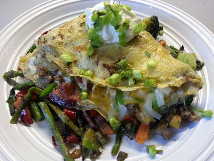 Fill omelet with shredded of each: pepper jack cheese, Vermont cheddar, extra sharp cheddar, Longhorn cheddar, 1 piece cooked and crumpled bacon and sausage, slivered white onion and green bell pepper. Place over veggies. I used an Asparagus Medley Stir Fry (found in frozen food section). Contains asparagus, broccoli, yellow squash, carrots, and snap peas cooked with olive oil, sea salt, cracked pepper, and garlic powder. Topped with organic sour cream and green onions.