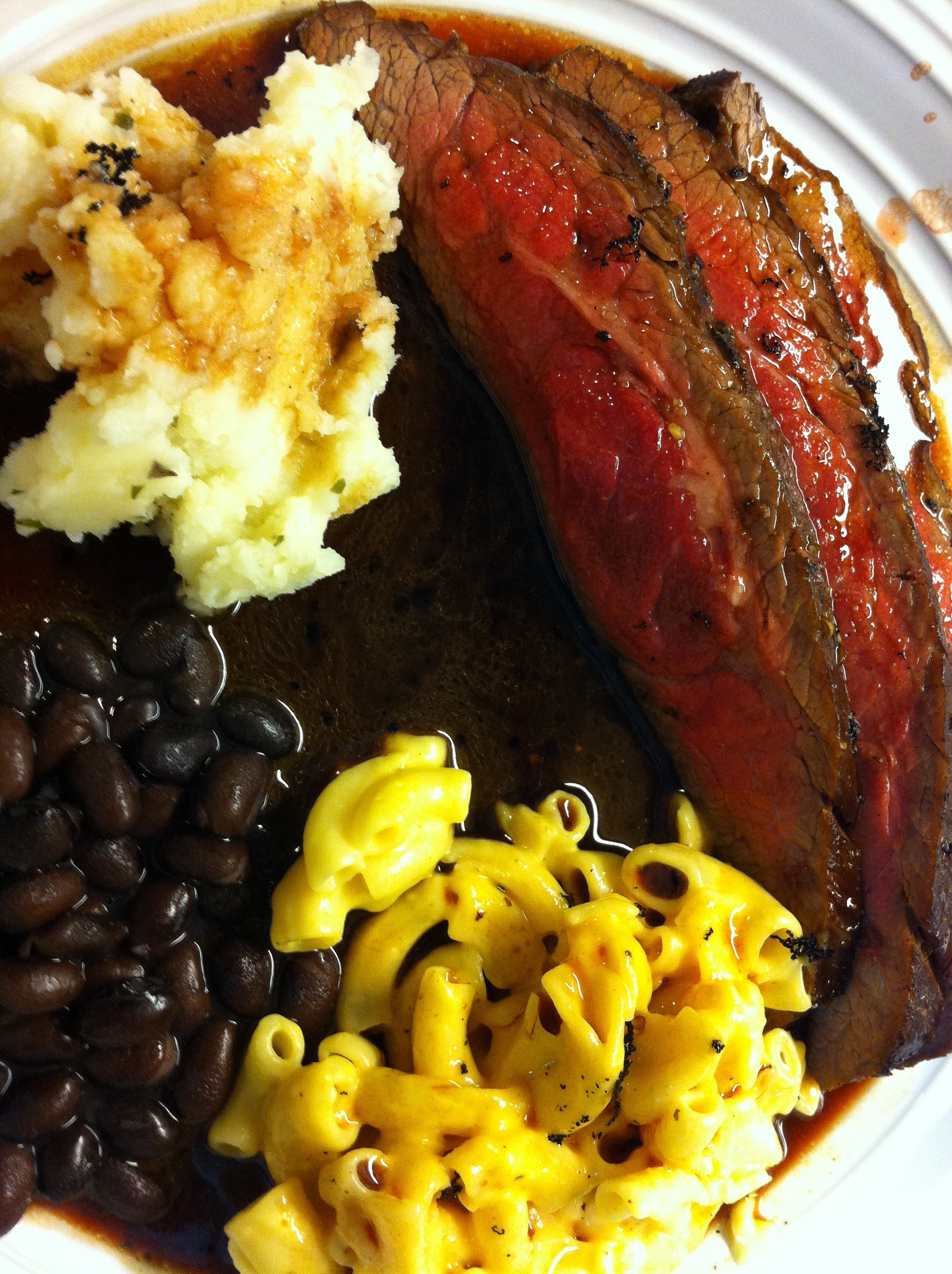 Dinner: marinated Angus Flank Steak, garlic tarragon mashed potatoes, black beans, garlic peppered macaroni and cheese. 2lb flank steak cooked from rare/medium all the way to medium/well done. Tastes awesome, was a huge hit 🙂