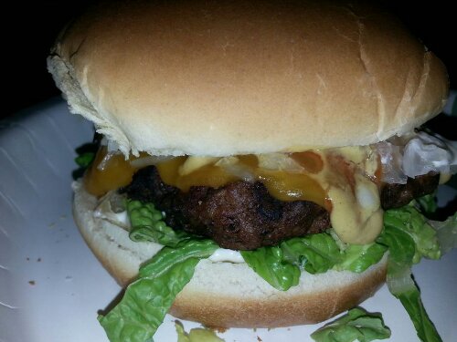 My 4th of July Burger. The meat is fresh ground local Angus, seasoned with sea salt, coarse black pepper, nutmeg, chili powder, paprika, garlic, mesquite liquid smoke and then grilled. The rest: olive oil mayo, Dijon mustard, finely chopped onions, organic ketchup, extra sharp cheddar cheese. The nutmeg and liquid smoke make it tastes nice a hearty and earthy. I was extremely popular.