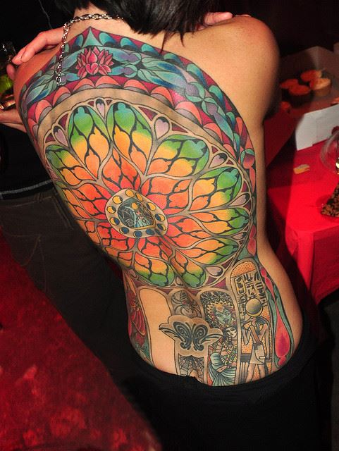 Amazing Full Back Brilliant Colors Indian Floral Tattoo