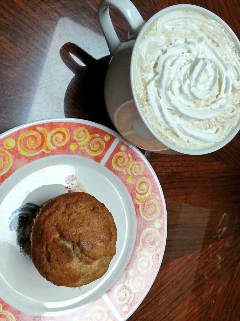 Fresh Banana Walnut muffins w/our Hazelnut coffee and whipped cream.