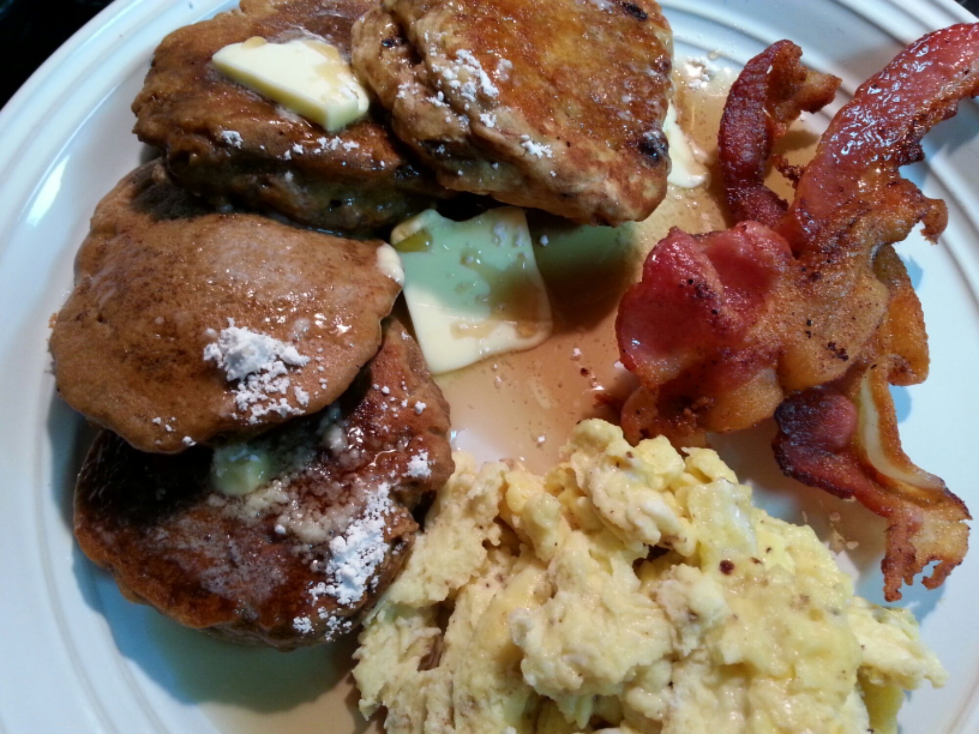 French Coffee Pancakes with Powdered Sugar and French Coffee with French Vanilla sugar free, fat free Torini Syrup.