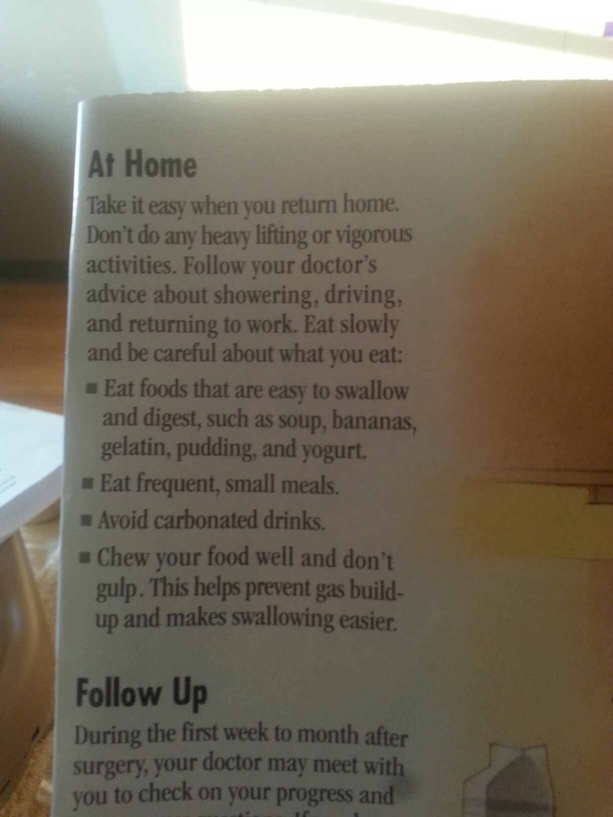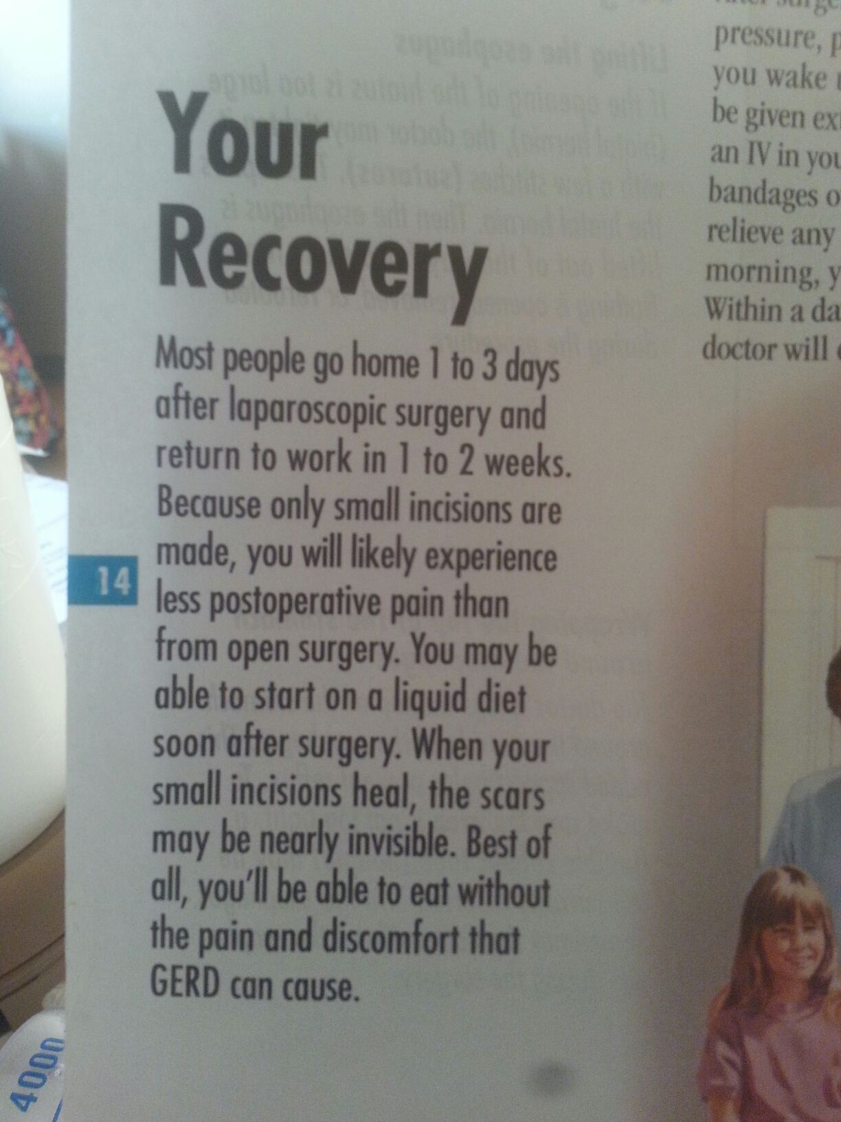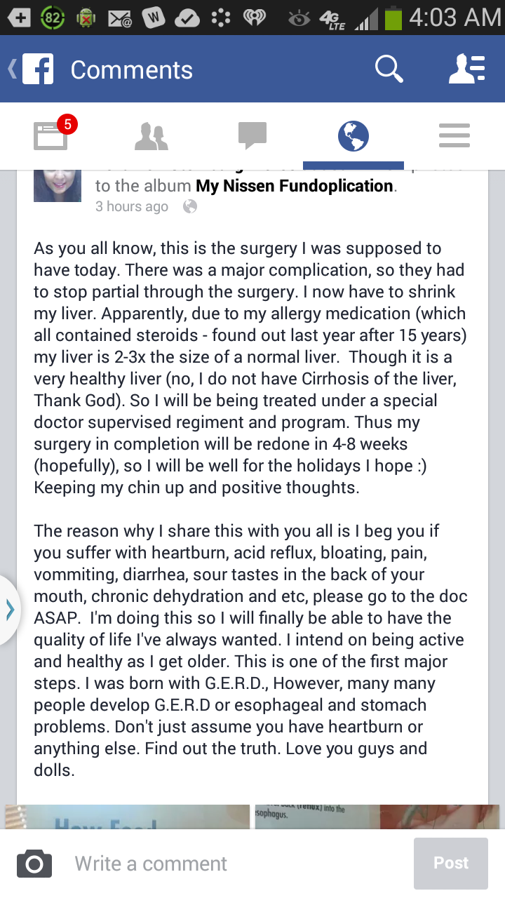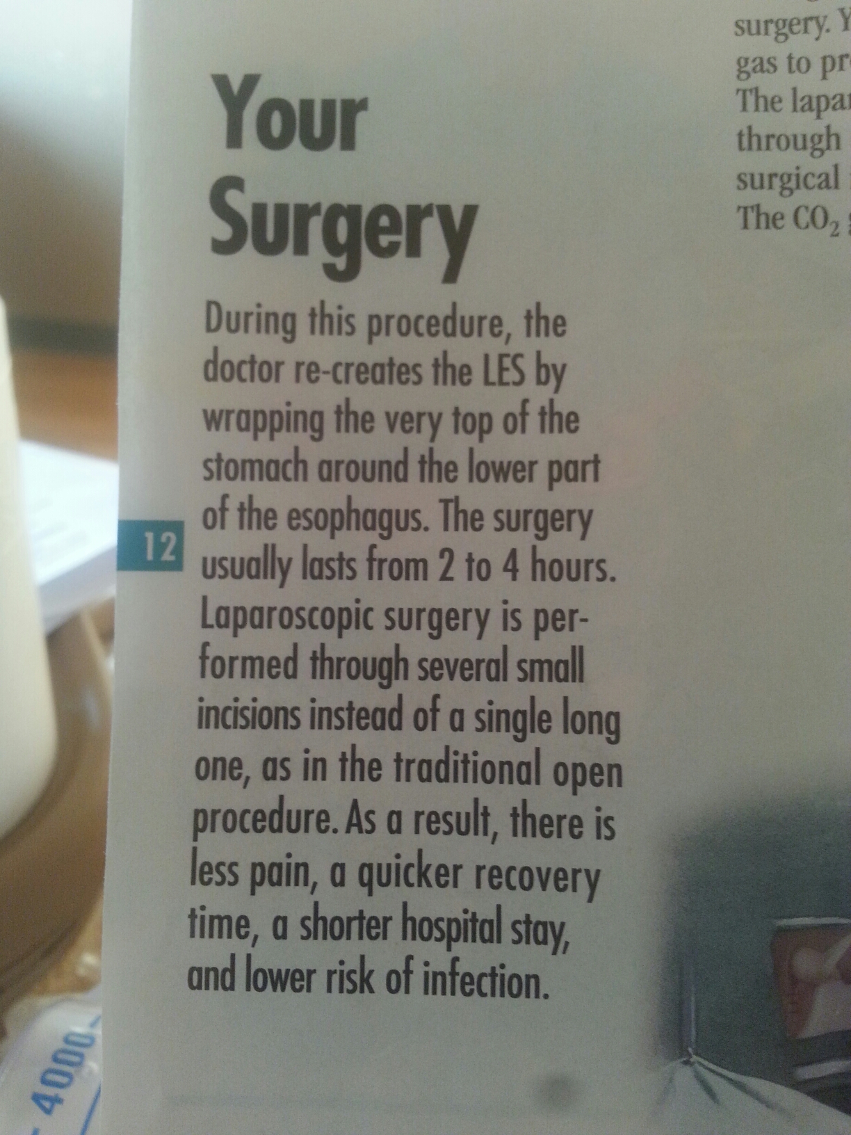 Well, there were complications today. Apparently from all the steroids they gave me to stop my allergies from turning in to bronchitis and that going into pneumonia, over 15 years, my liver is 2-3 times the size of a regular liver. No Cirrhosis, the liver itself is very healthy. However, I’m going to have to go on super monitored special diet to shrink it over the next 2 months. Then, after that we will redo the Fundoplication. They discovered this in mid procedure today 😦