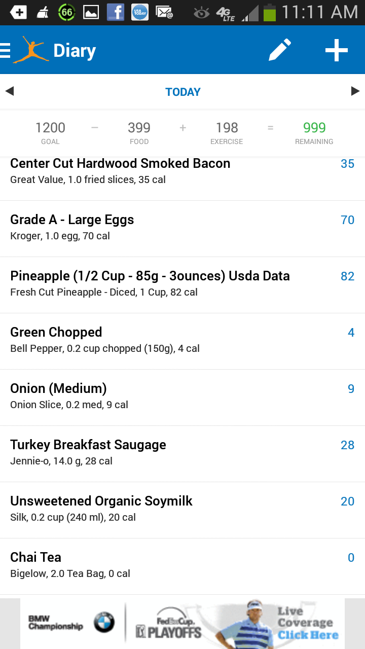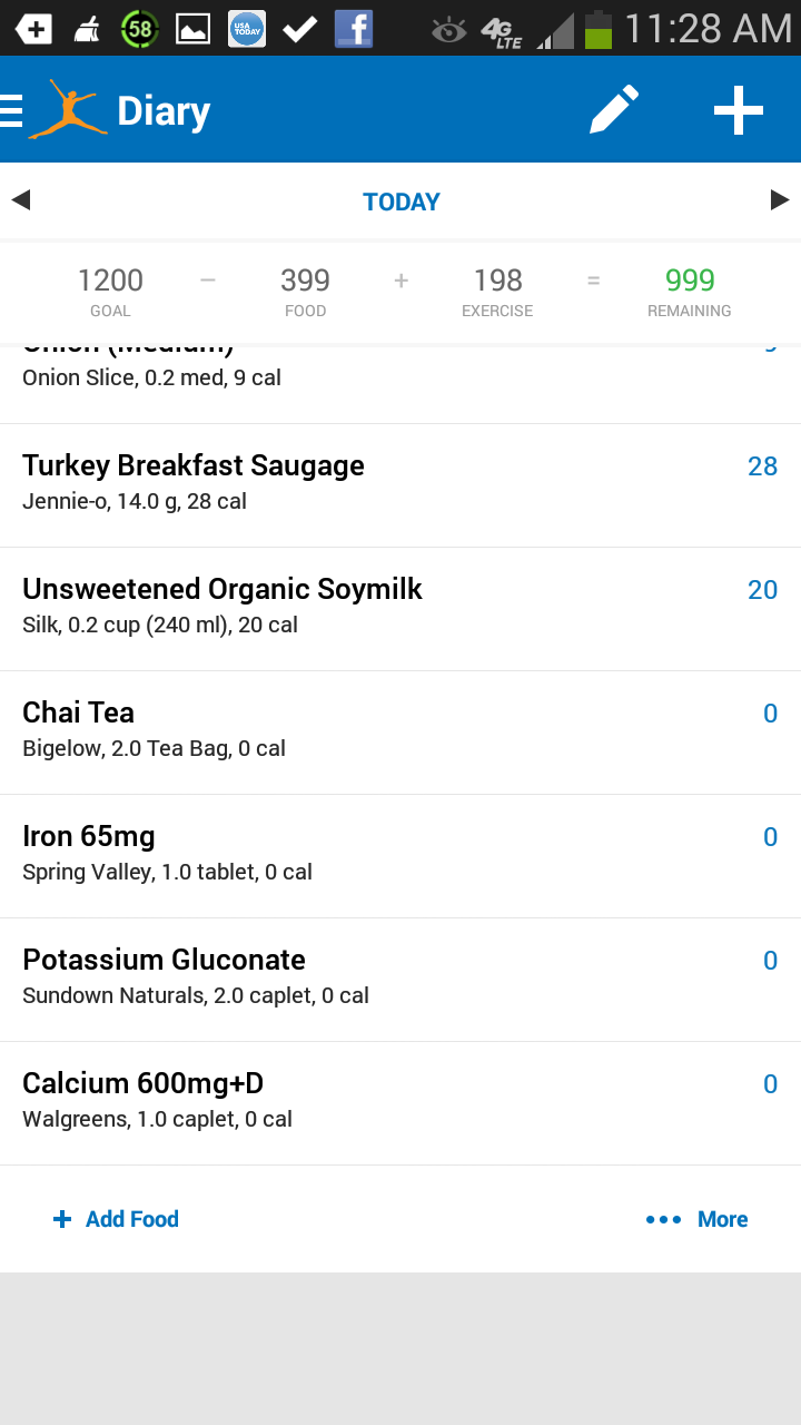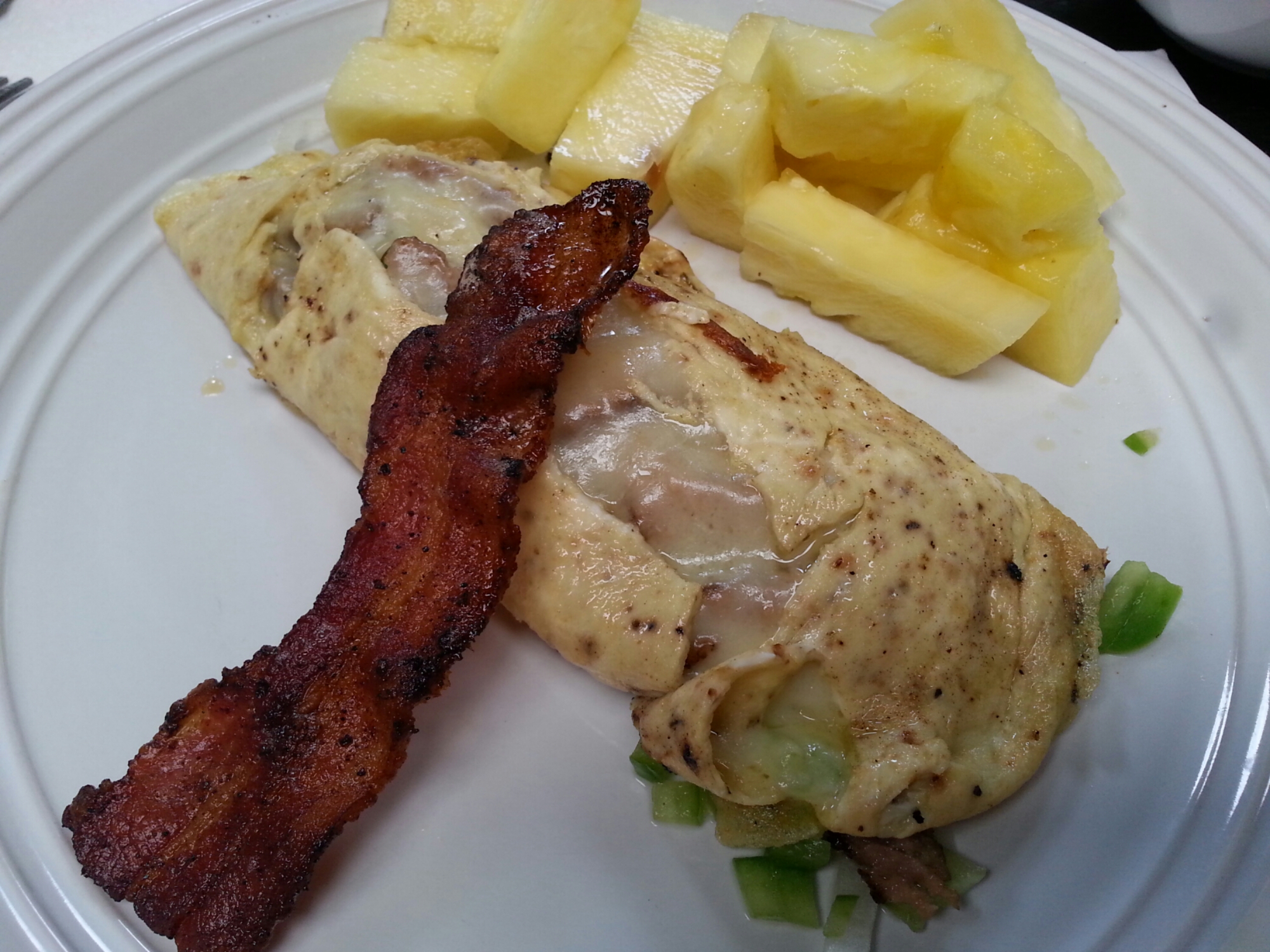 1egg, 2sl. Provolone, 1sl. ctr. cut bacon, 1/2sl. turk. sausage, onion, green bell pepper, 1/2cp. Pineapple, Indian Spice Chai Tea, Stevia, unsweetened soy milk. Plus, vitamins 😉 Can you tell I’m gearing up for my 45th birthday coming up? Lol 😉