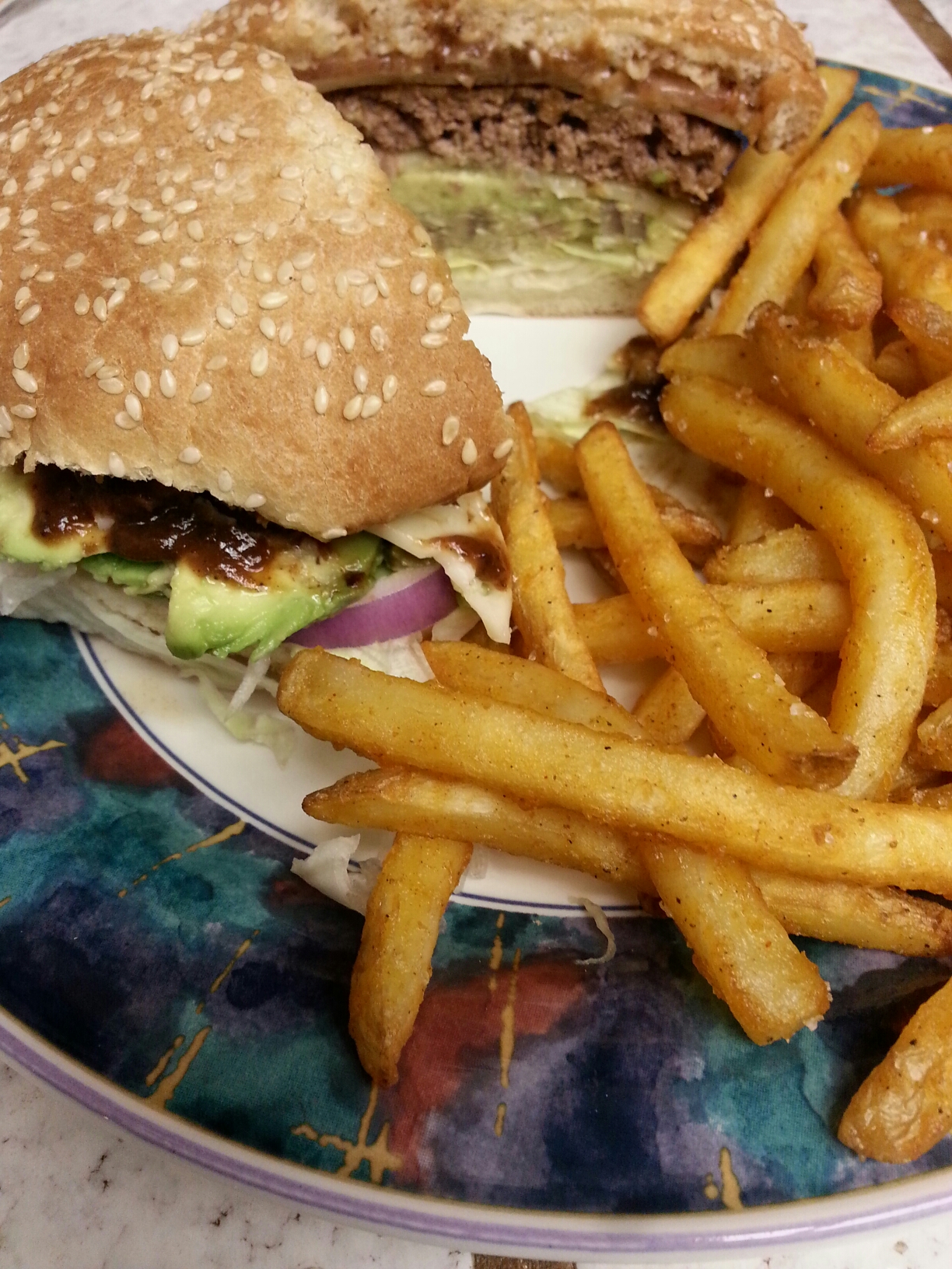 Seasoned Angus beef, aged baby swiss, Haas avocado, with bold steak sauce, romaine lettuce, roma tomato, olive oil mayo, on a toasted sesame bun, with seasoned fries, and sea salt.