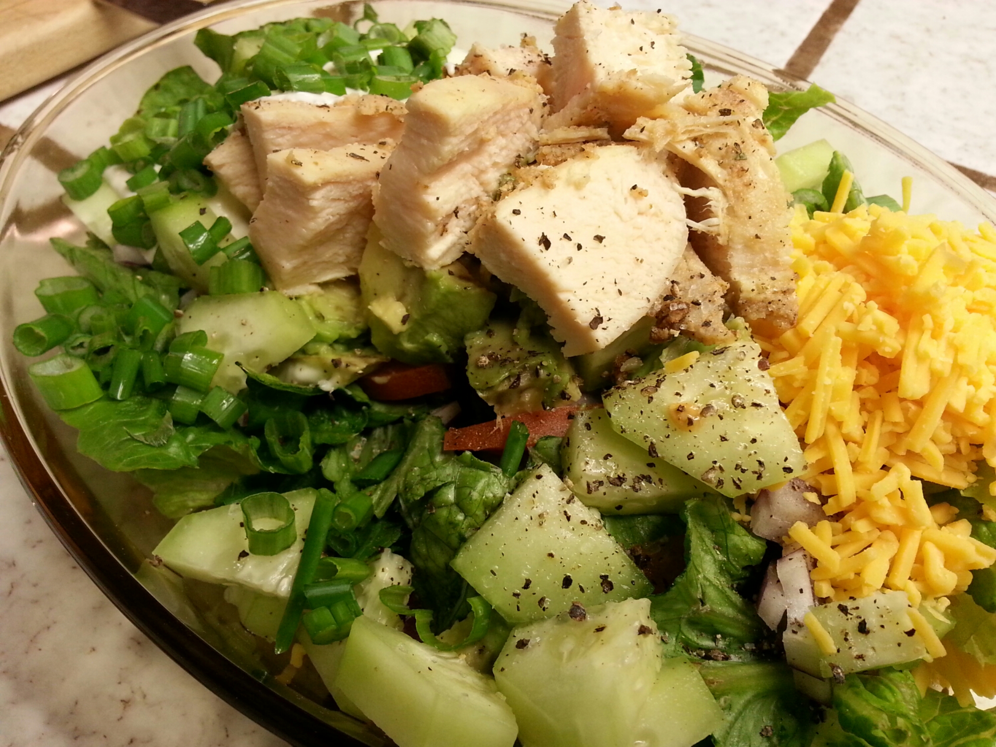 Parma cheese & chilli powder lightly breaded chix breast, cooked in olive oil, topped salad of romaine, Haas avocado, green onion, red onion, cucumber, roma tomato, Bob’s Big Boy Blue Cheese dressing, sea salt, cracked pepper.