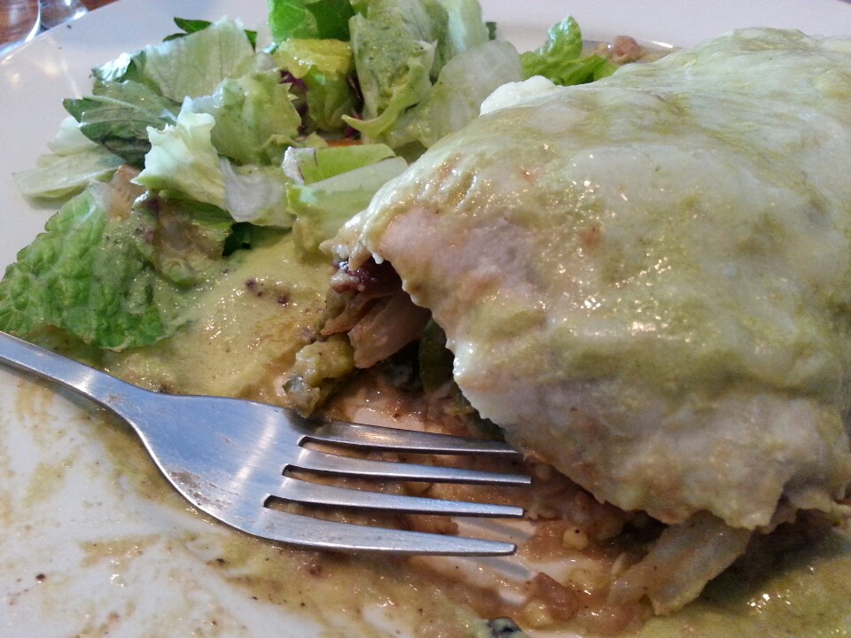 Carne Asada beef and chilies burrito with green chili sauce side salad (I duplicated a local restaurant’s recipe).