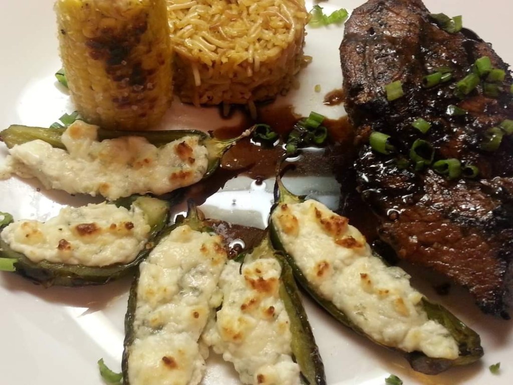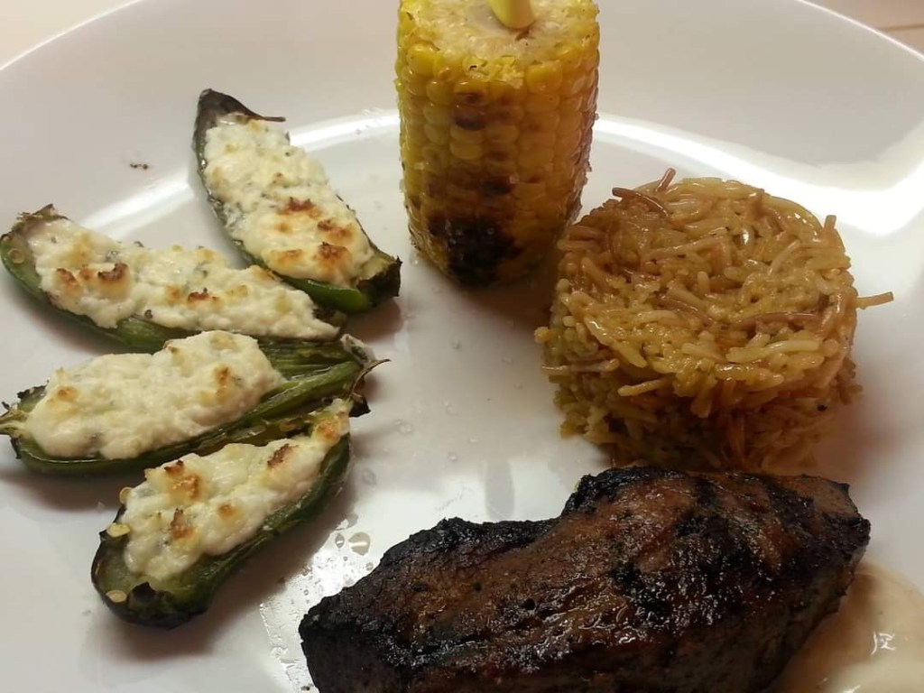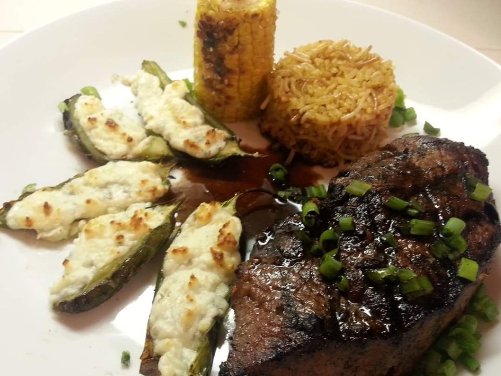 Angus Ribeye, grilled corn, beefy rice, crab stuffed cream cheese jalapeno. Just showed my husband and I think I saw him drool.