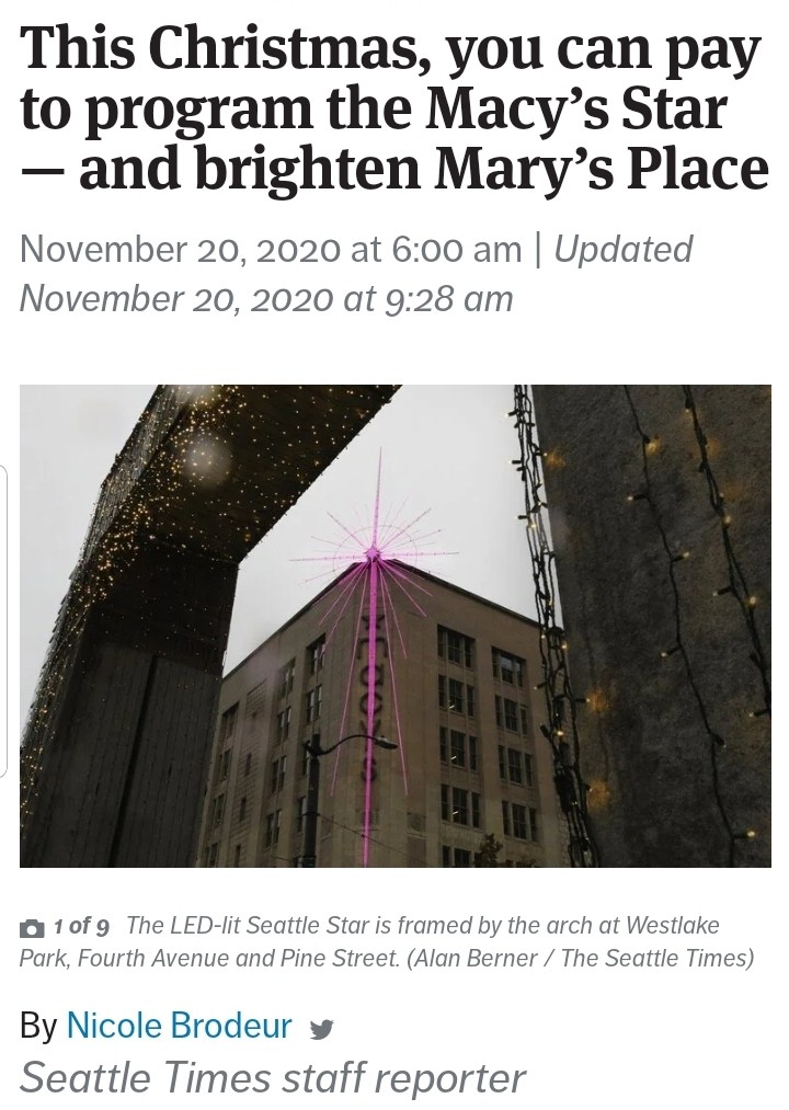 Starting Friday, Nov. 20, people can reserve a time slot on the star and choose from patterns and colors to create their own, 15-second custom display on the star for $15; more money buys increments of one minute, 15 minutes and 30 minutes.