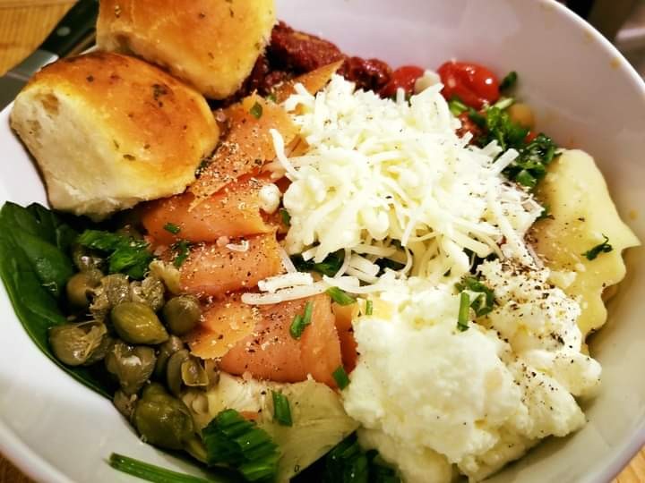 Three Cheese Ravioli, on top of sauteed organic grape tomatoes, w/ organic baby spinach, w/ organic minced garlic, in California Olive Oil. Topped w/ Wild Caught Lox, Capers, Sun Dried Tomatoes, Artichoke Heart, Avocado, Ricotta, shaved Parma, Asiago, Romano cheeses. All in a Rosa Garlic Alfredo sauce w/ bacon bits and minced garlic. Topped w/ chives. Side: garlic herbed bread.
