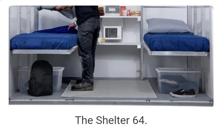 The temporary housing comes in 64’cu.ft. and 100’cu.ft. There is a heater and air conditioner and storage in each unit and can sleep 2 comfortably. There is no bathroom or kitchen, as this is temporary housing, and what cause the cost to dramatically increase due to wiring and plumbing. They are looking to make kitchens and bathrooms as individual units In the future.