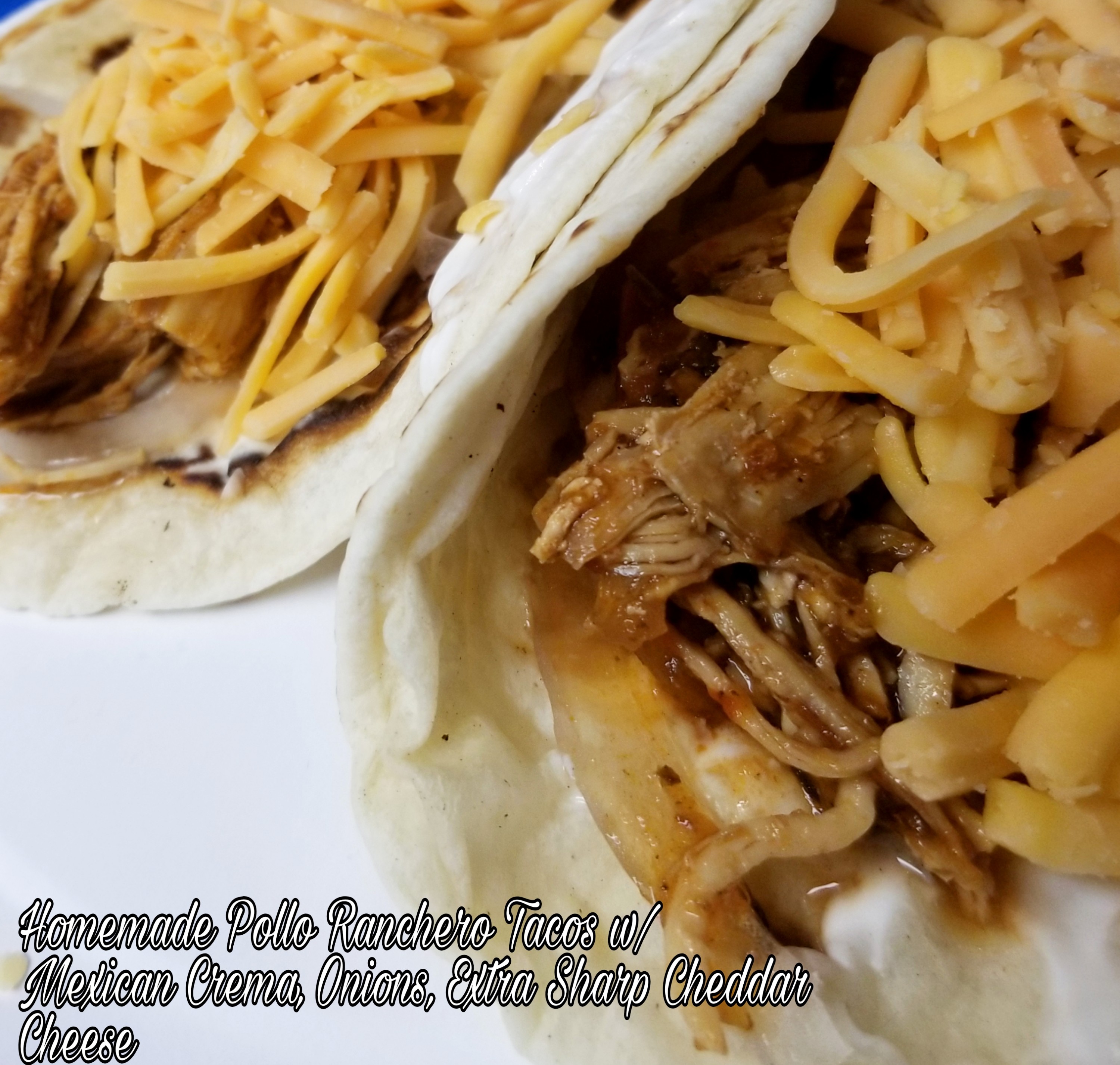 Wipe pan clean after chicken is done. I do lightly oil my skillet again, and griddle some flour tortillas, last night I cheated, used store bought that I still Griddled. I like making my own too. They just taste way better when you griddle them either way. Slapped some crema in the tortilla, added chicken mixture, thin sliced white onion, extra sharp cheddar cheese. Viola.