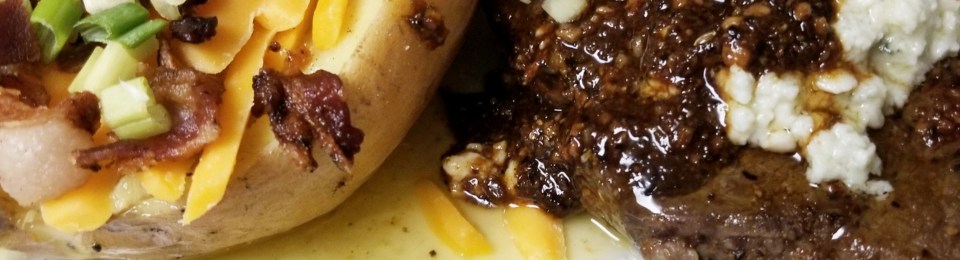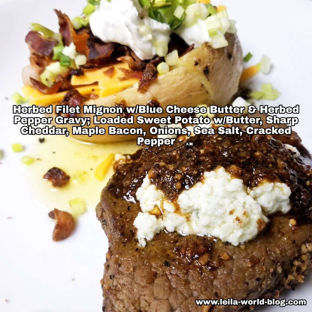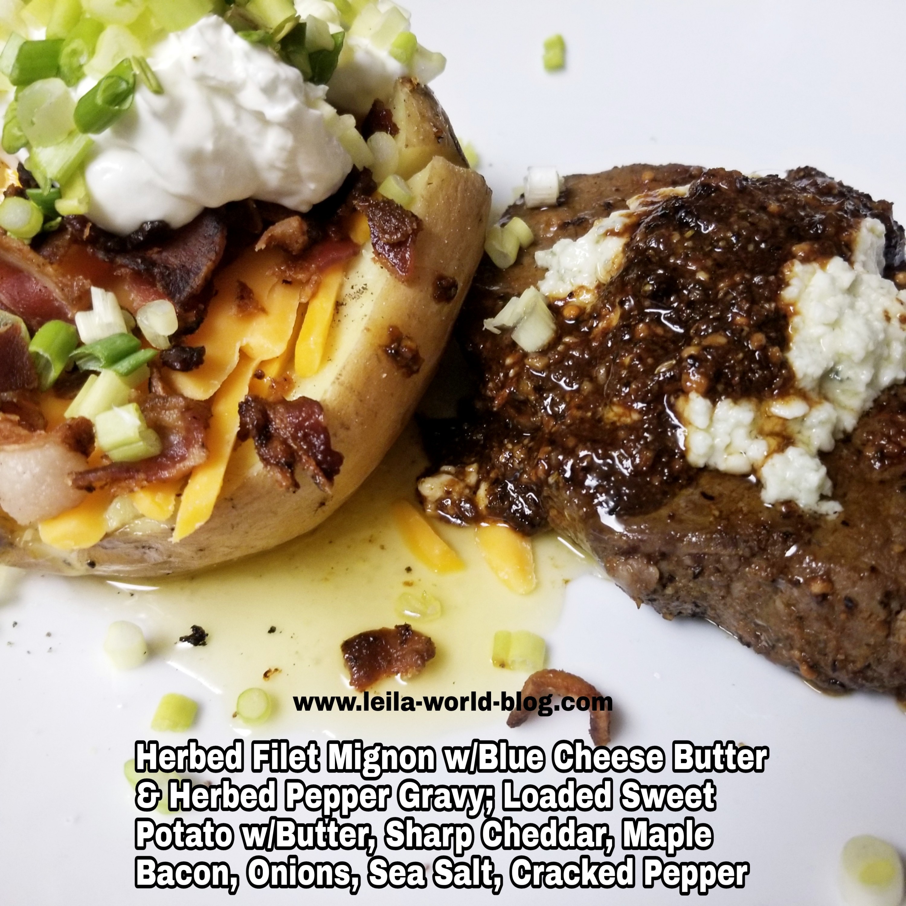 As you know I love to cook. So today, I made the perfect dinner. Herbed Filet Mignon w/Blue Cheese Butter & Herbed Pepper Gravy; Loaded Sweet Potato w/Butter, Sharp Cheddar, Maple Bacon, Onions, Sea Salt, Cracked Pepper. He loved it, and so did I.