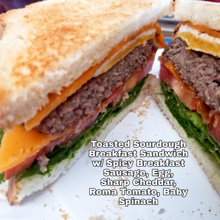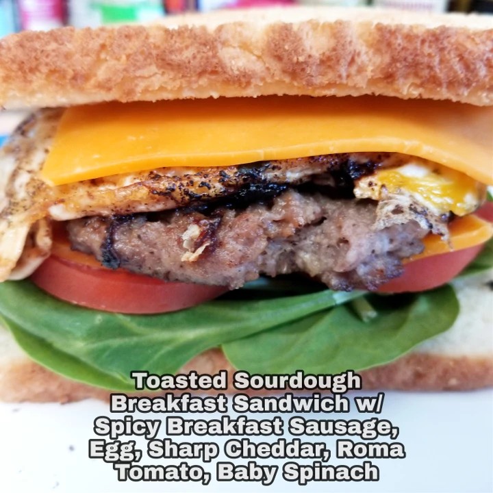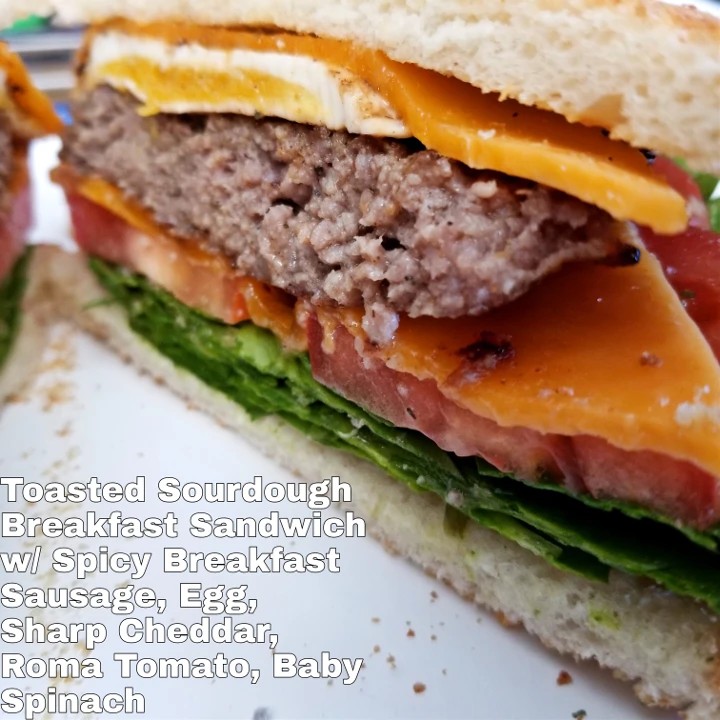 Toasted Sourdough Breakfast Sandwich w/ Spicy Breakfast Sausage, Egg, Sharp Cheddar, Roma Tomato, Baby Spinach.