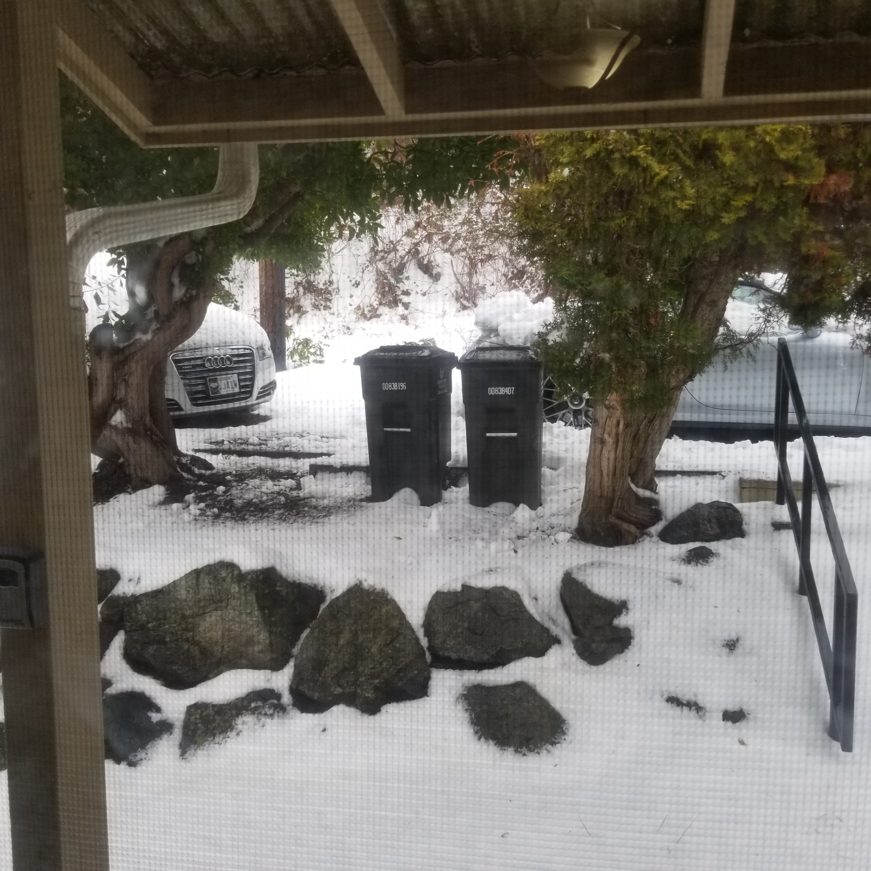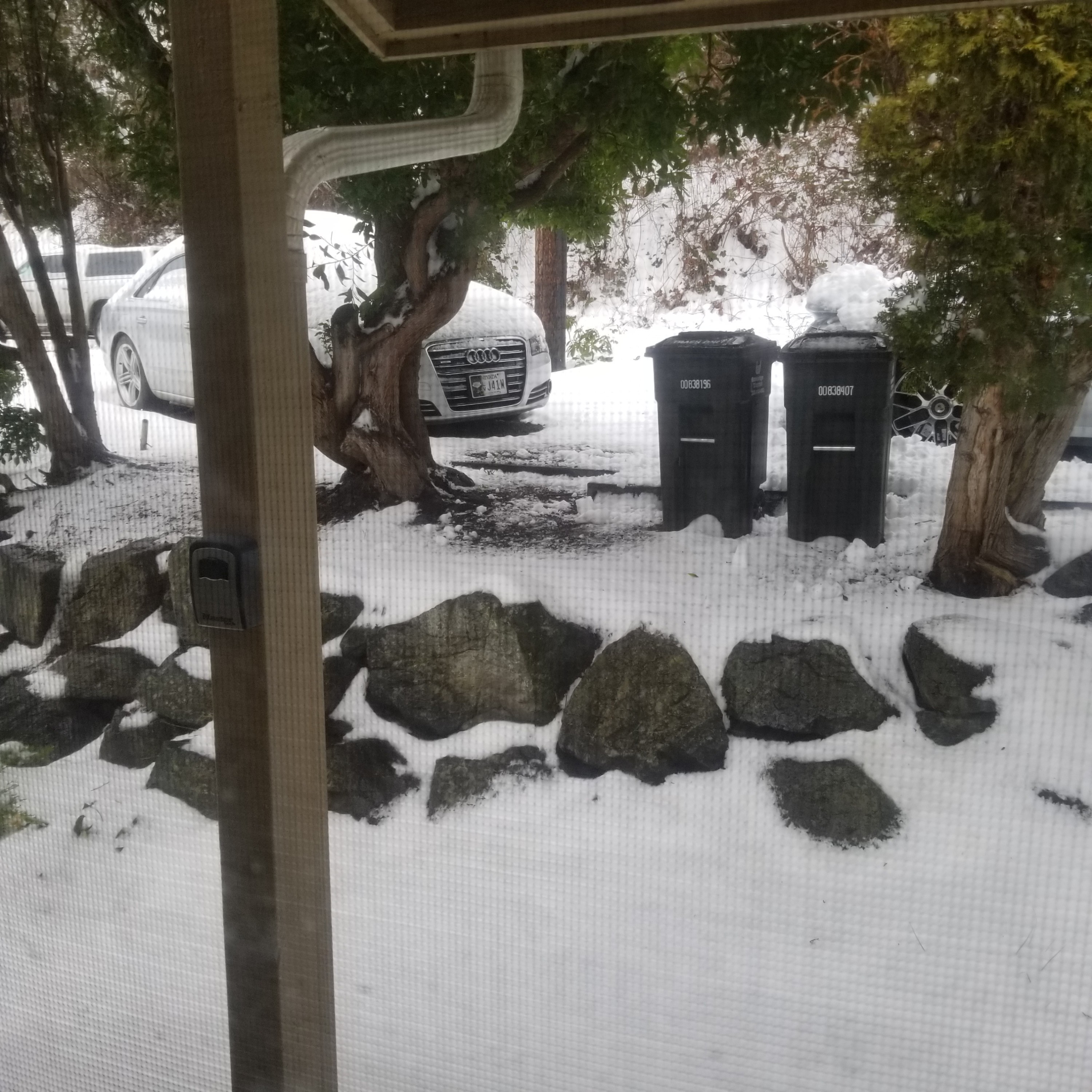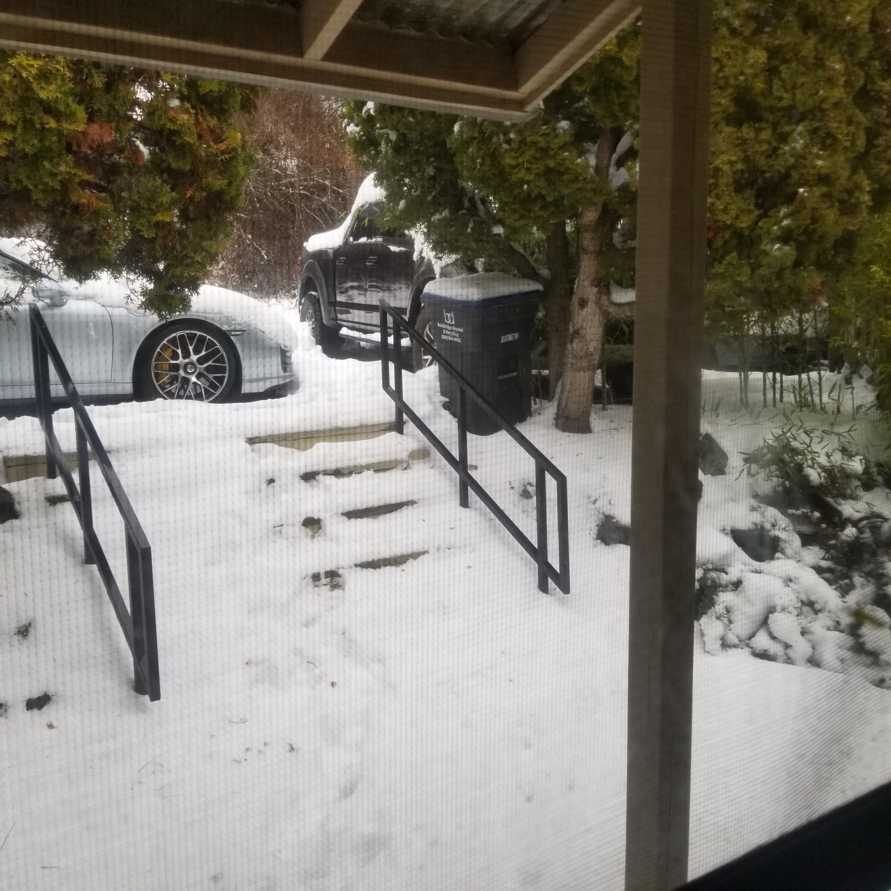 Well it’s been snowing for 3 days. Probably have gotten a foot. Our house is on the side of a hill so our parking is elevated. This particular house doesn’t have a garage, but, fortunately we have lots of parking. In plus, it’s shielded from the street (the house and parking).