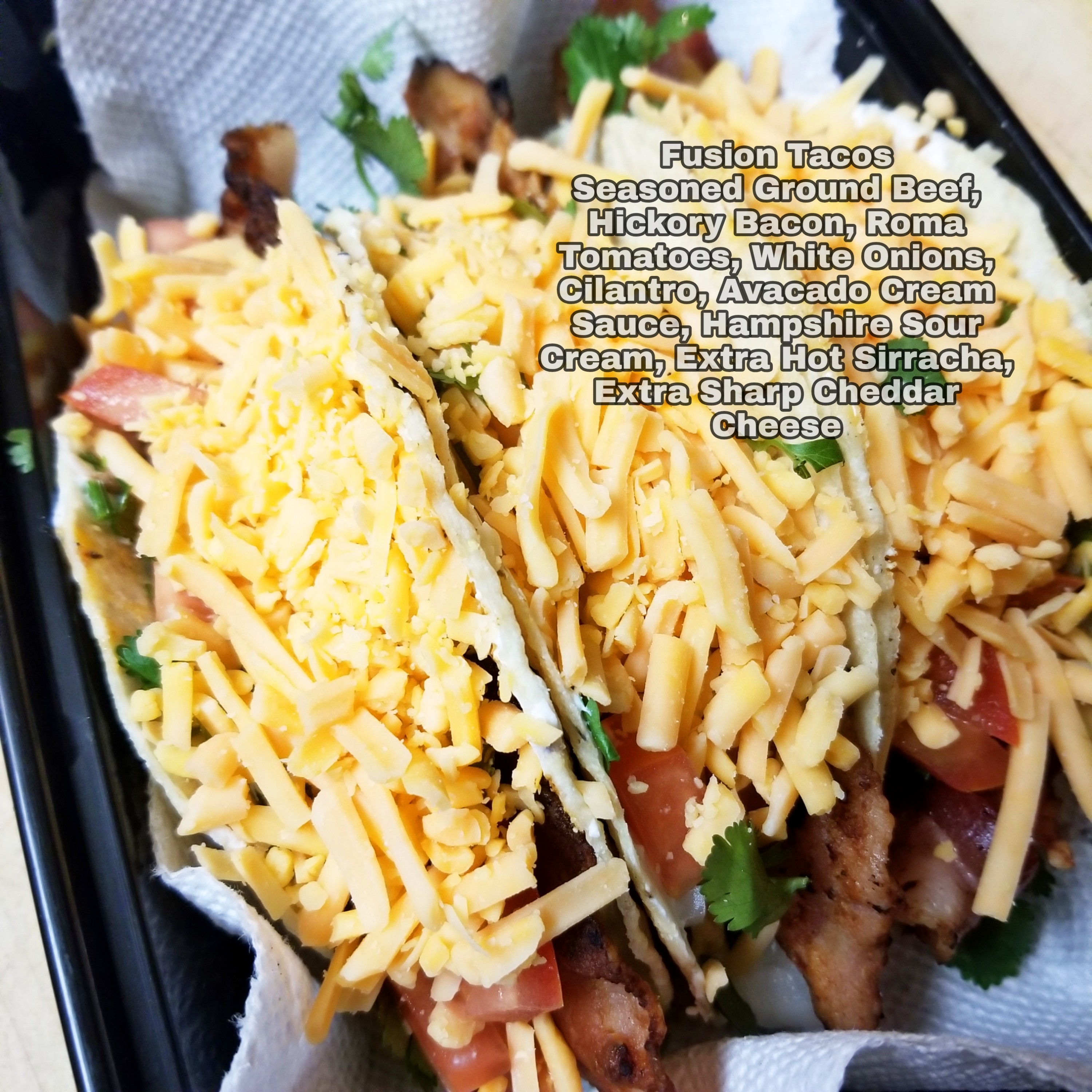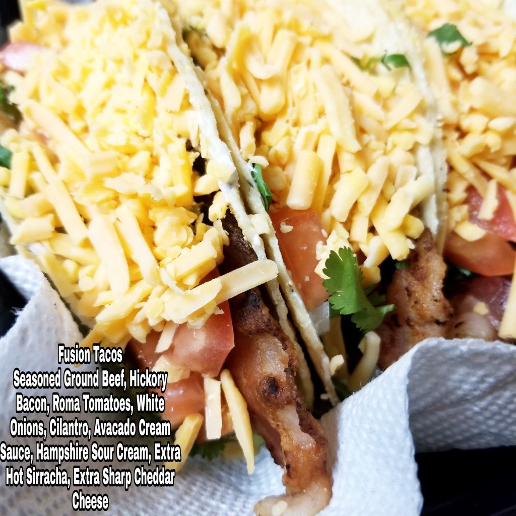 Seasoned Ground Beef, Hickory Bacon, Roma Tomatoes, White Onions, Cilantro, Avacado Cream Sauce, Hampshire Sour Cream, Extra Hot Sirracha, Extra Sharp Cheddar Cheese