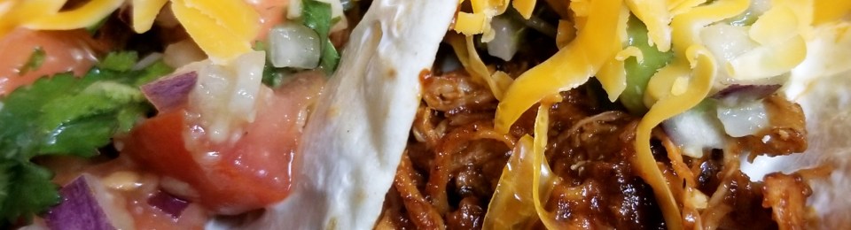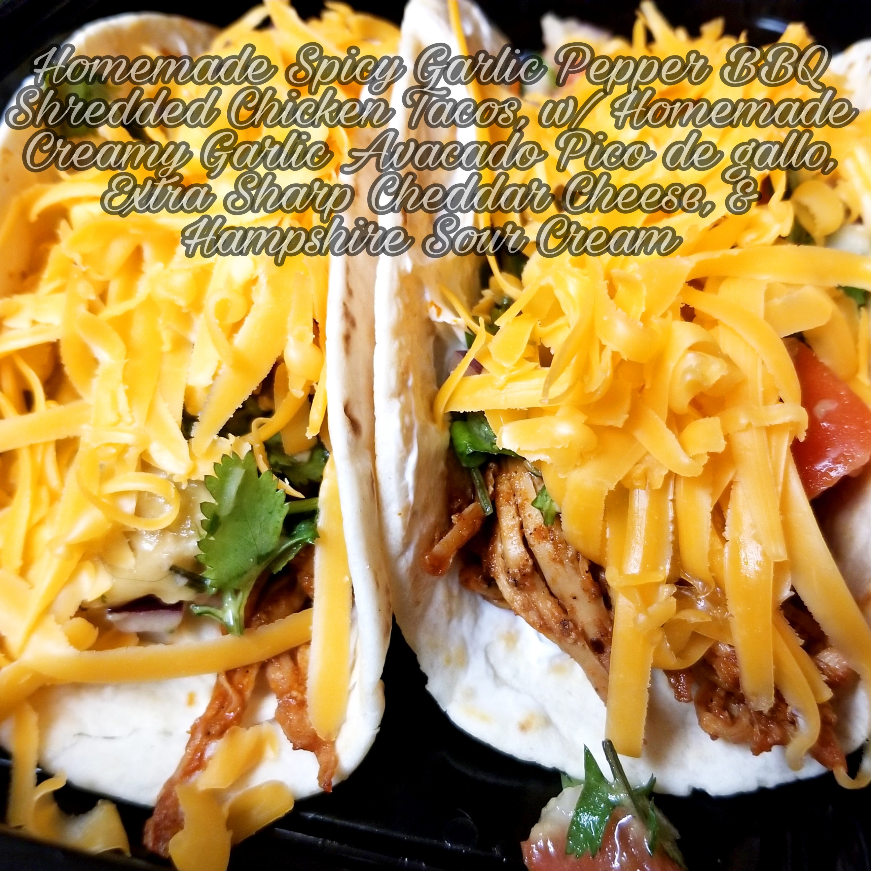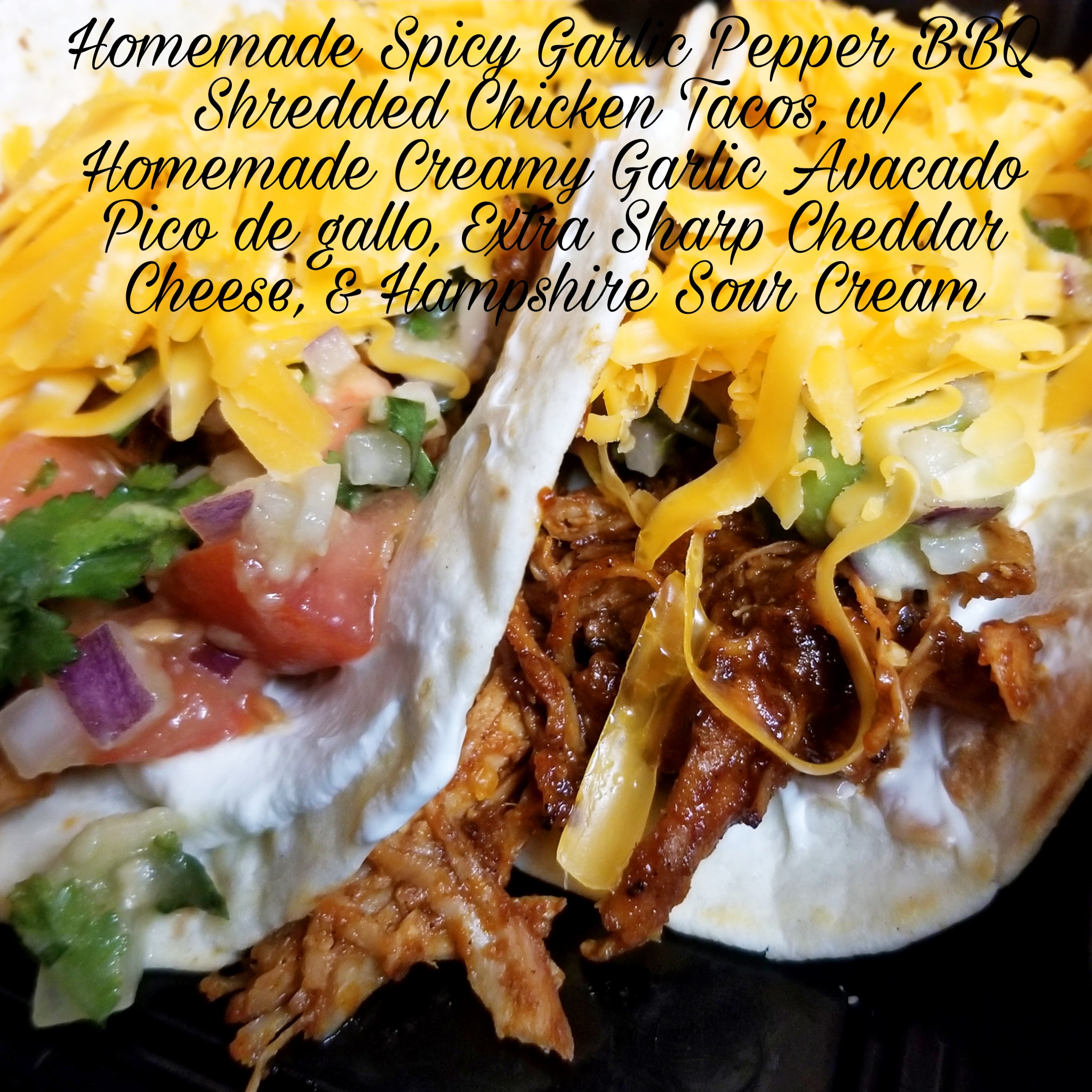 Homemade Spicy Garlic Pepper BBQ Shredded Chicken Tacos, w/ Homemade Creamy Garlic Avacado Pico de gallo, Extra Sharp Cheddar Cheese, & Hampshire Sour Cream