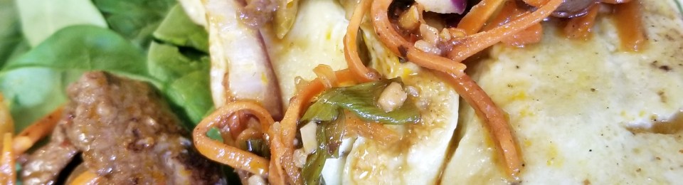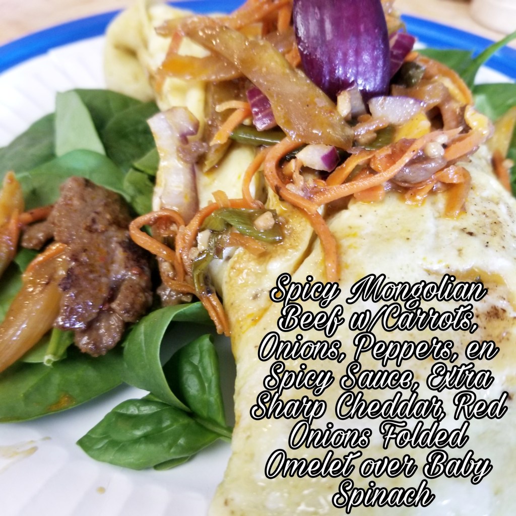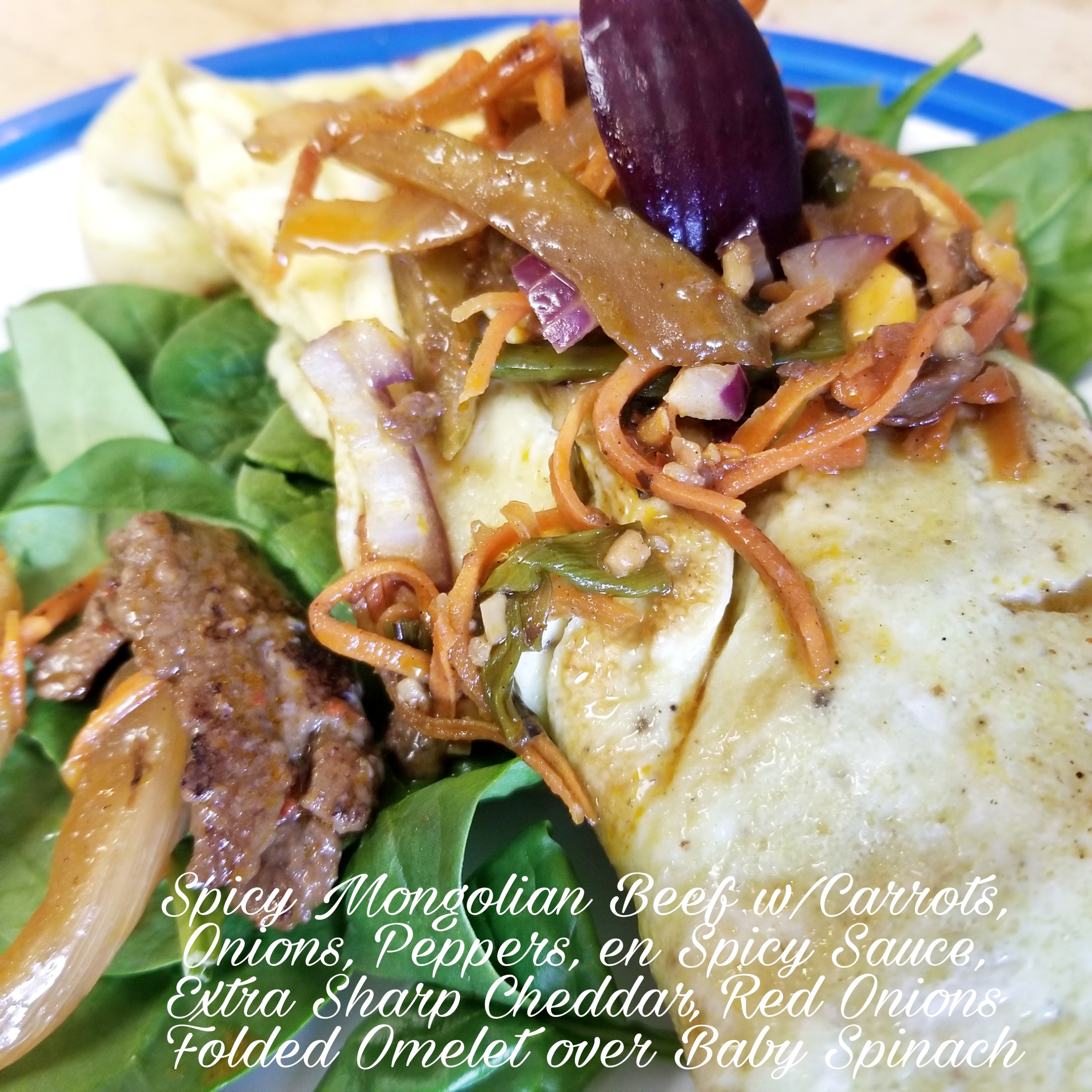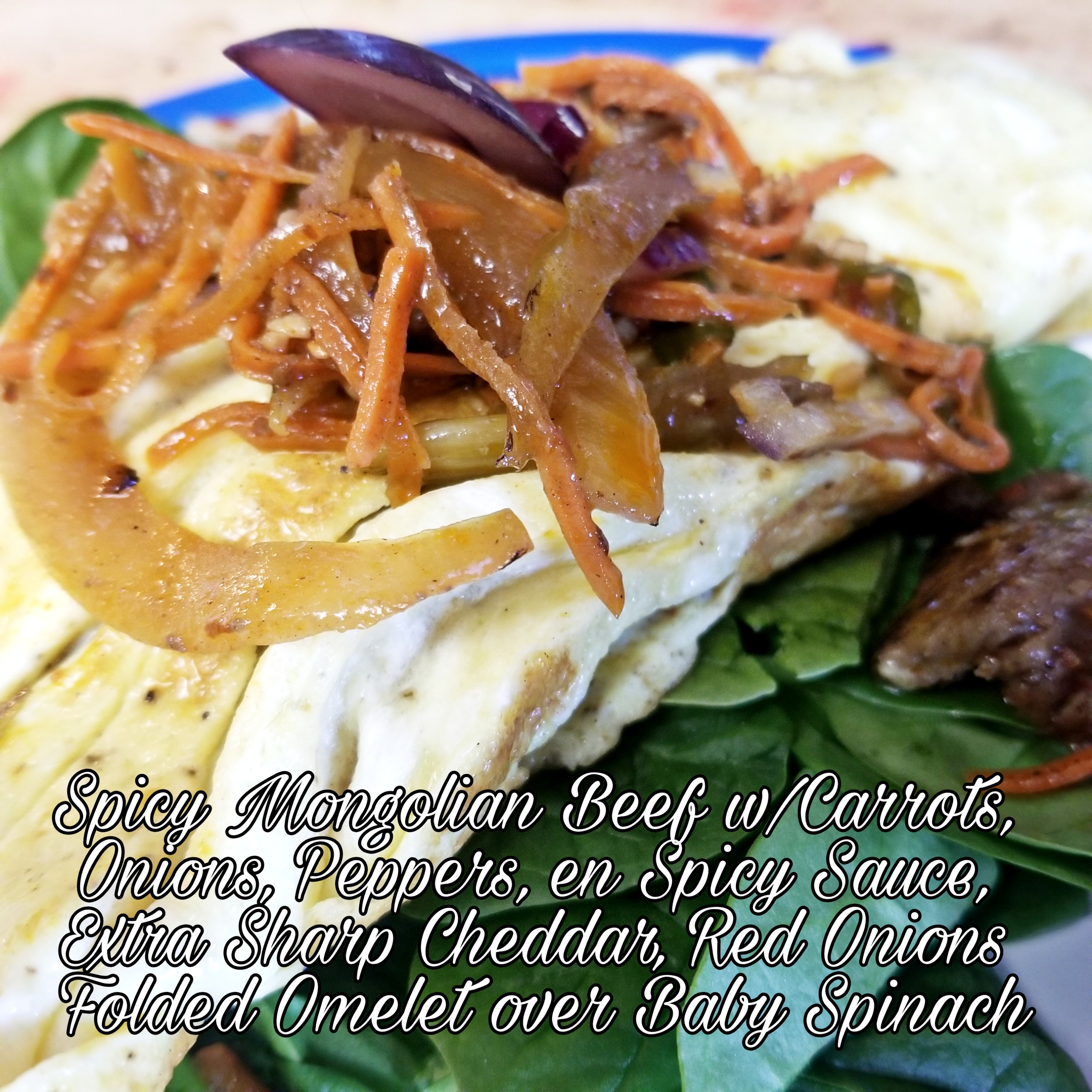 Spicy Mongolian Beef w/Carrots, White Onions, Chili Peppers, Red Onions, Extra Sharp Cheddar Cheese folded Omelet over Baby Spinach.