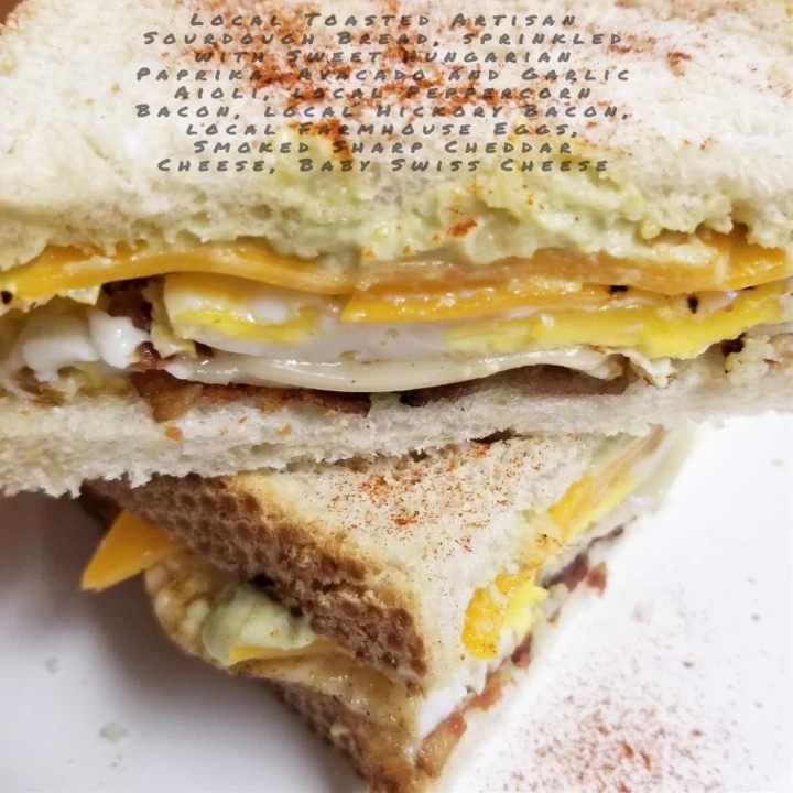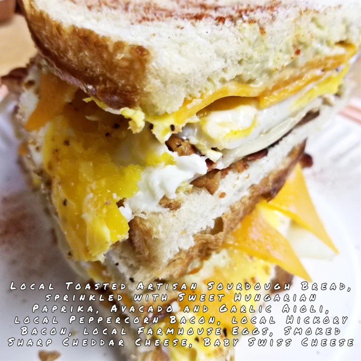 Local Toasted Artisan Sourdough Bread, sprinkled with Sweet Hungarian Paprika, Avacado and Garlic Aioli, local Peppercorn Bacon, local Hickory Bacon, local Farmhouse Eggs, Smoked Sharp Cheddar Cheese, Baby Swiss Cheese.