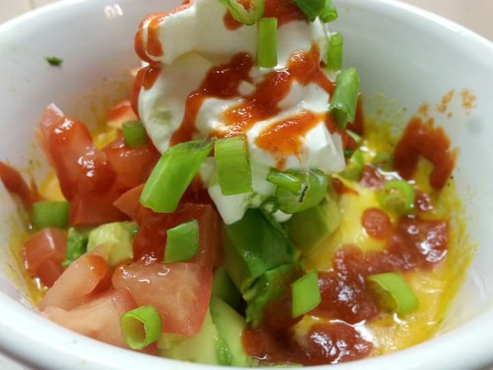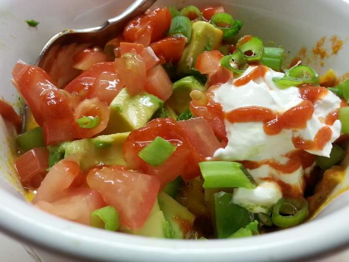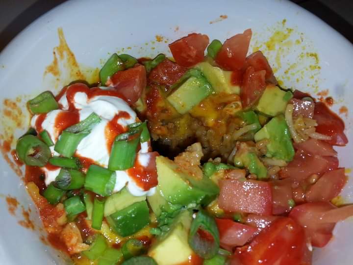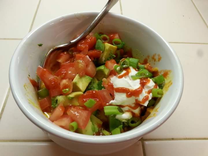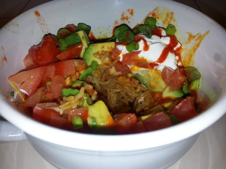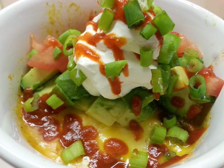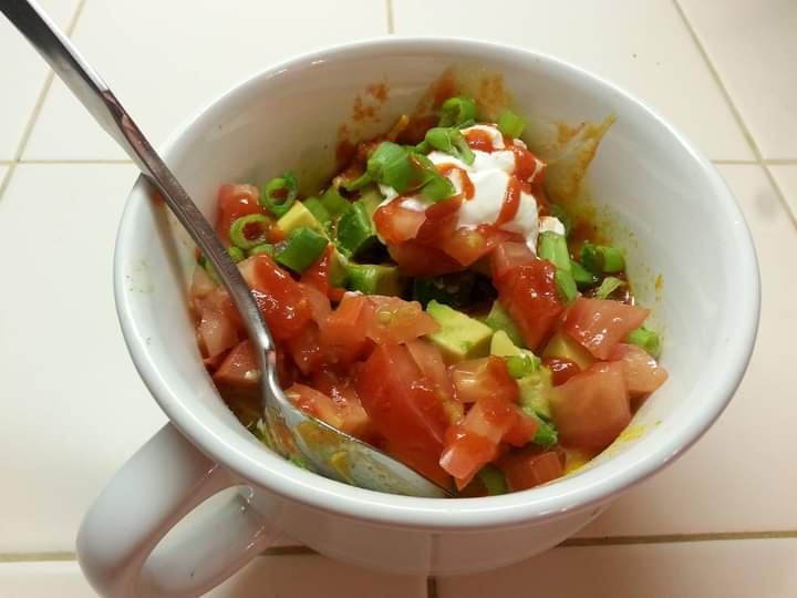 So, I cooked really late last night, worked late. Actually drove into my neighborhood to a sign warning, saying “high bear activity”. 👍 One of my favorite dishes to make is a left over cup dish. I had left over cheesy rice. Topped with Sirrachi, Colby Jack, Extra Sharp Cheddar, coarse sea salt, Madras curry powder, garlic powder, nuked. Add fresh 1/2 avocado, Roma tomato, sour cream, green onion, Sirrachi sauce. #delsh