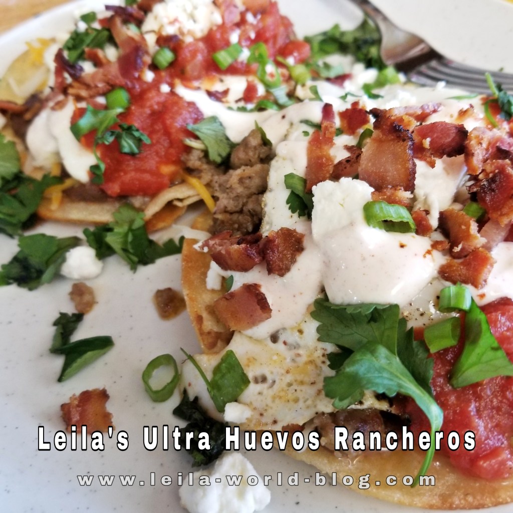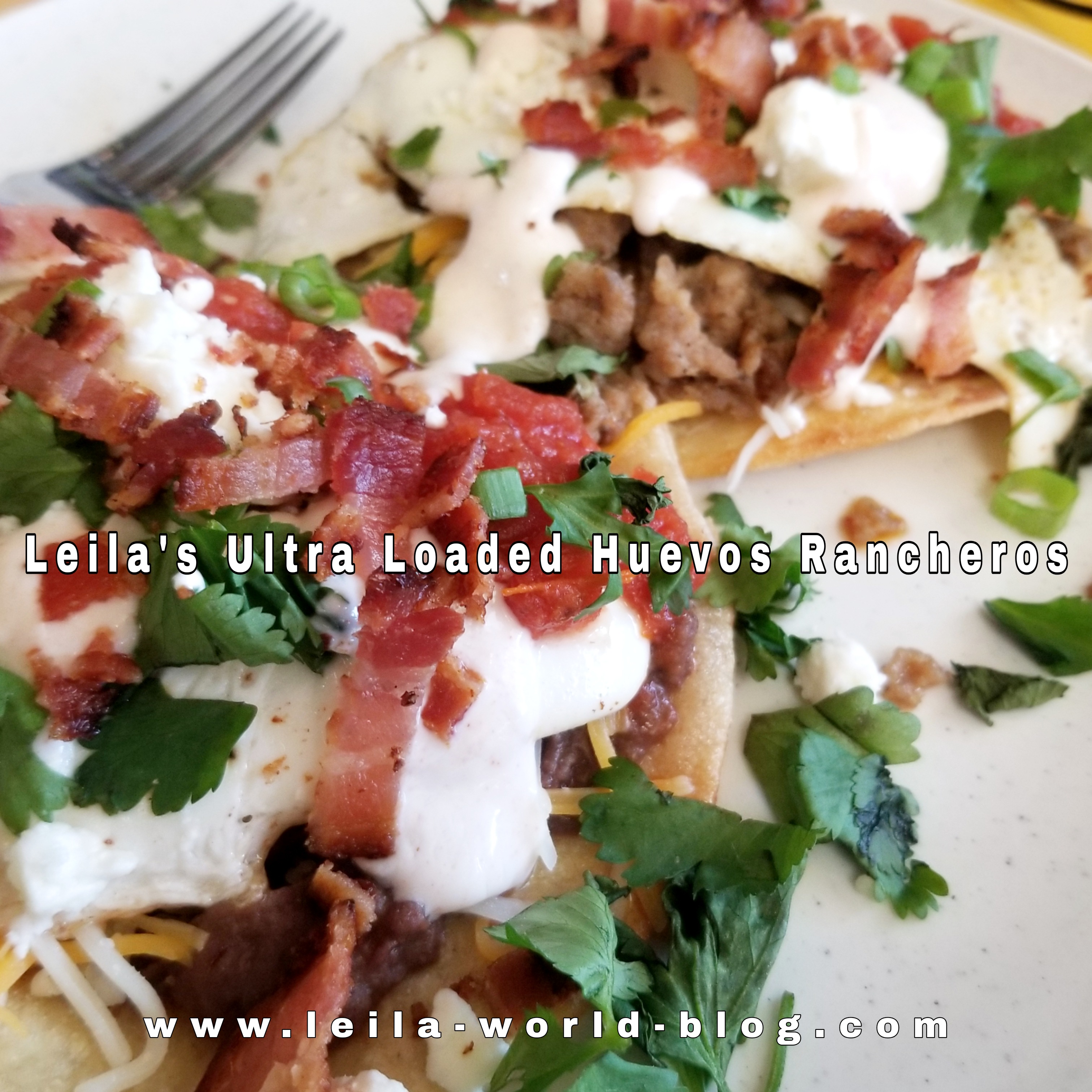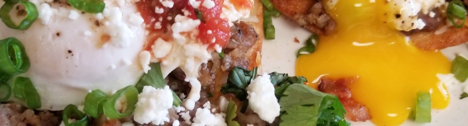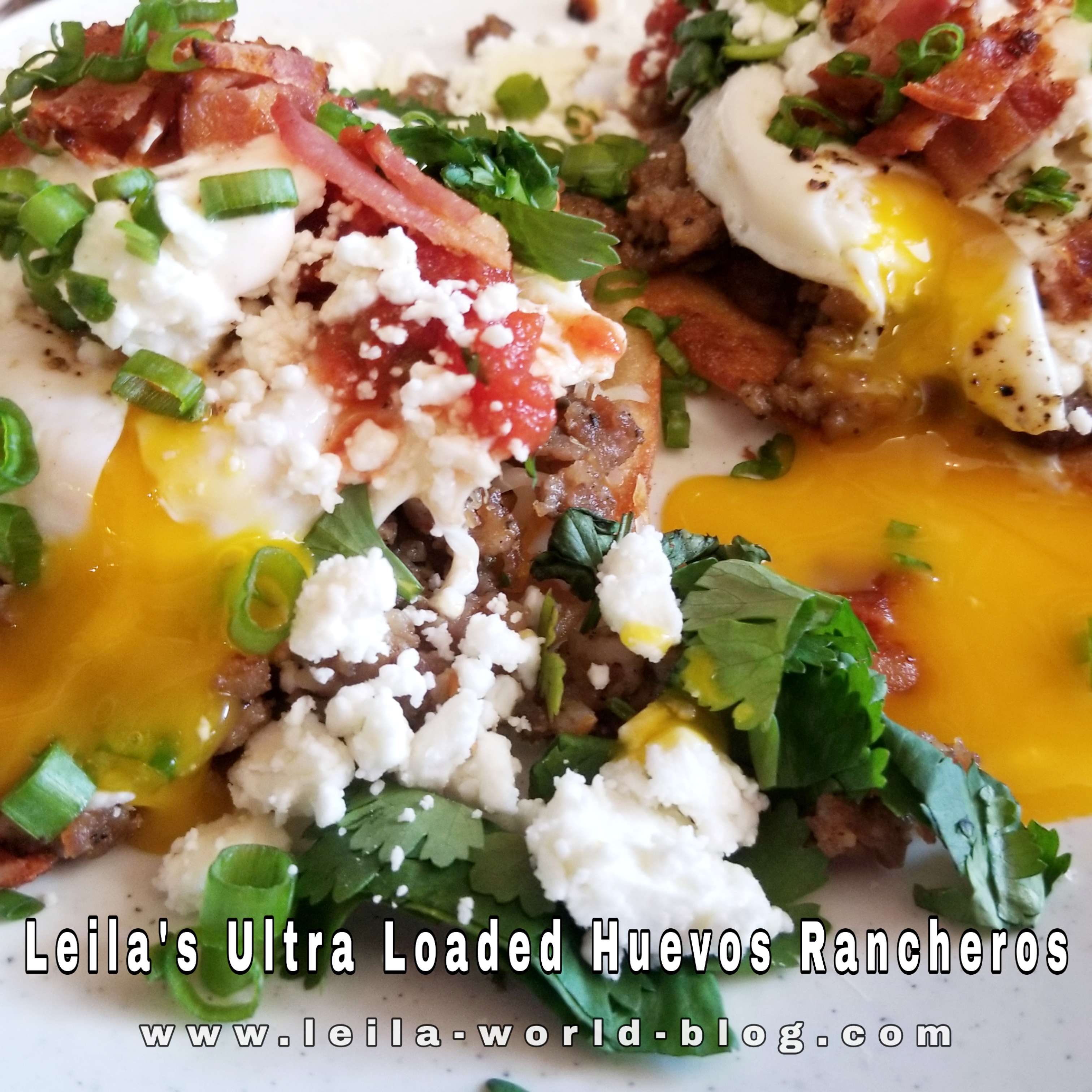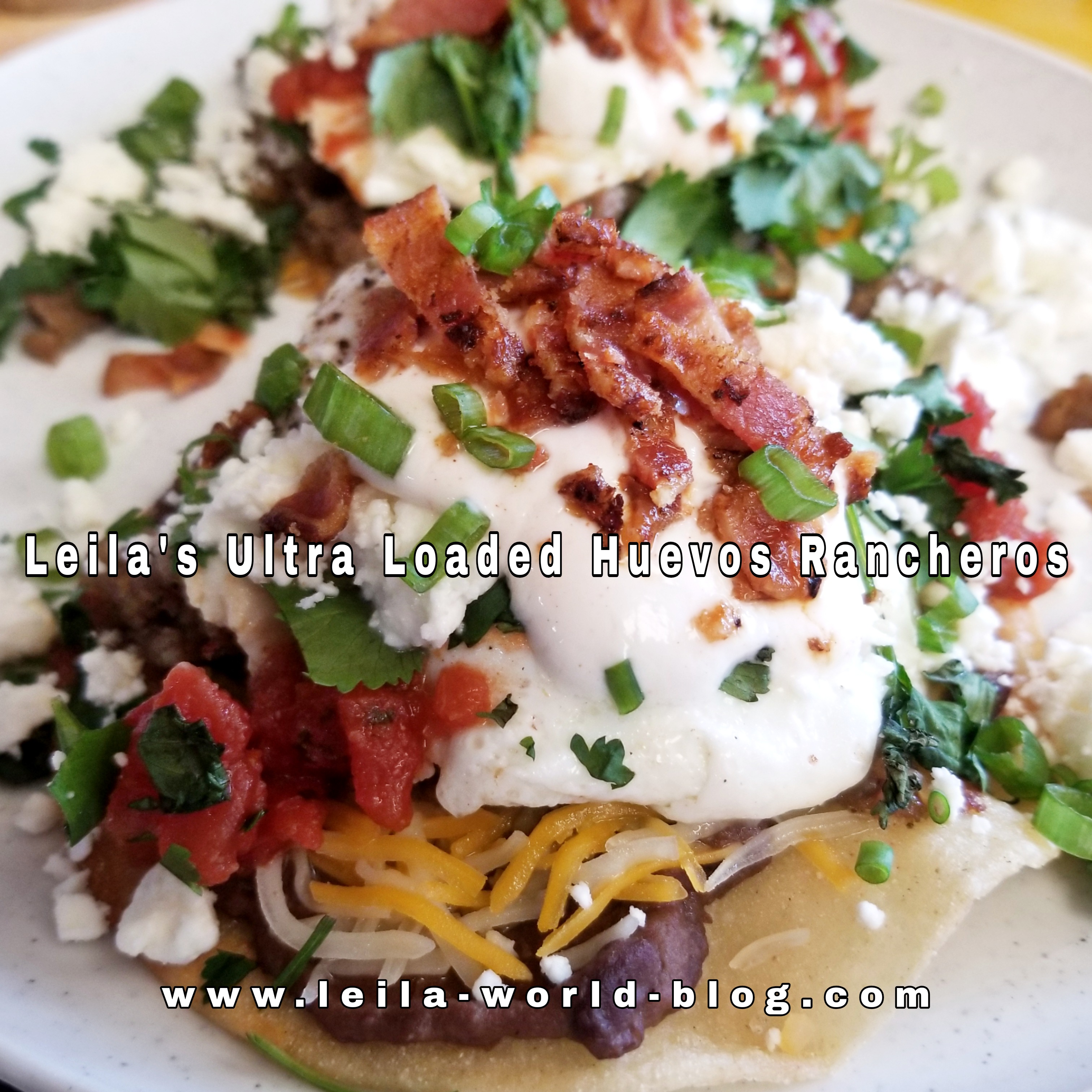 Fried Corn Tortillas, dusted with coarse Sea Salt. Refried Black Beans. Mexican Cheese Blend. Spicy Breakfast Sausage. Poached Egg. Cilantro. Homemade Spicy Red Salsa. Green Onion. Feta Cheese. Homemade Mexican Crema. Crumbled Hickory Thick Cut Bacon.