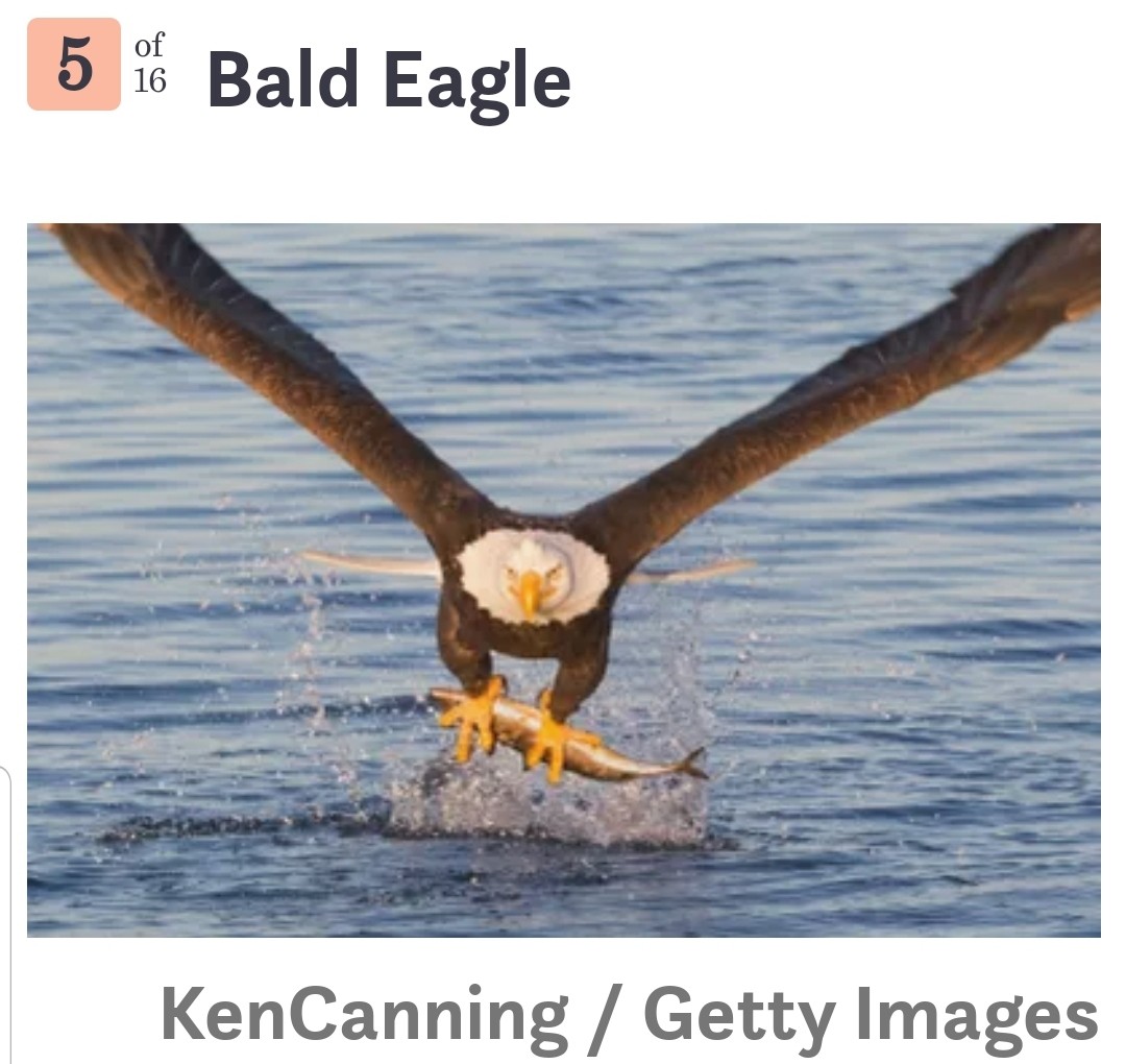 These powerful birds are one of the largest raptors in North America. They tend to live close to rivers, lakes, and ocean waters to hunt fish, but they have a varied diet that includes water birds as well as small mammals like squirrels, rabbits, and sea otter pups.
