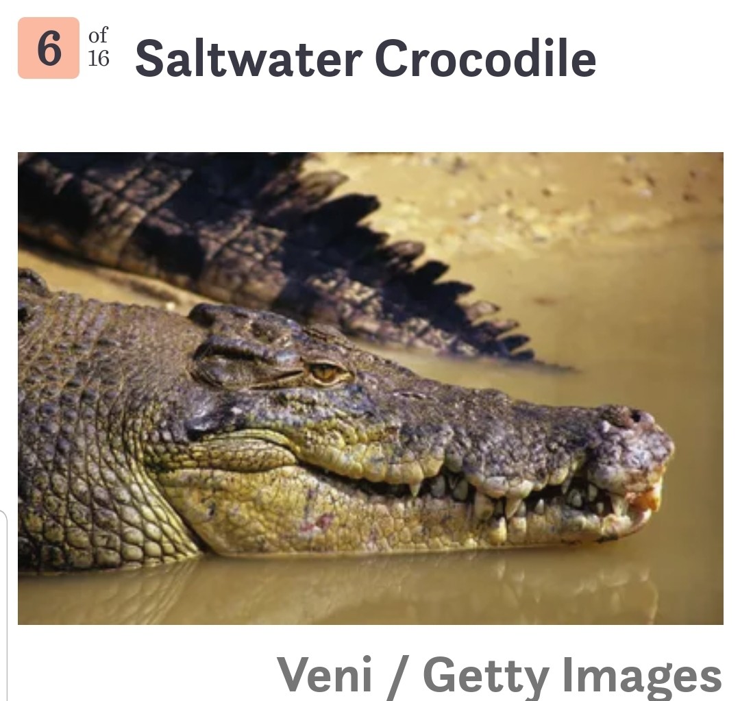 The world’s largest living reptile, saltwater crocodiles (Crocodylus porosus) can reach a whopping 21 feet in length (females are much smaller). They live near the coasts of northern Australia, New Guinea, and Indonesia, but range as far as Sri Lanka and India, southeast Asia, Borneo, and the Philippines.