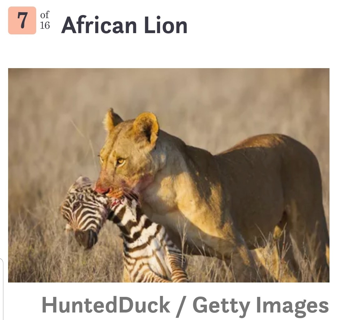 Lions live and hunt in prides although the killing itself is done by a single lion, usually a female, either by suffocation or breaking the prey’s neck. Prey vary by location, but include elephants, buffalo, giraffes, and gazelles, impalas, warthogs, and wildebeests. If larger prey isn’t available, lions will eat birds, rodents, fish, ostrich eggs, amphibians, and reptiles, as well as scavenge.