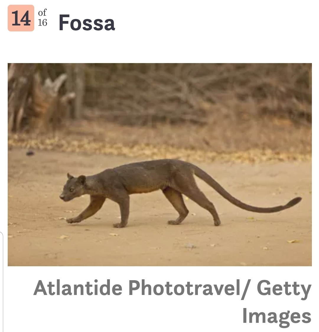 Among its favored prey are lemurs, which it pursues through trees with agility thanks to its long tail and retractable claws. Classified as endangered since 2000, the fossa’s habitat is increasingly fragmented by deforestation. They are also killed by people for entering villages, where they’re perceived as threats to poultry and small livestock.