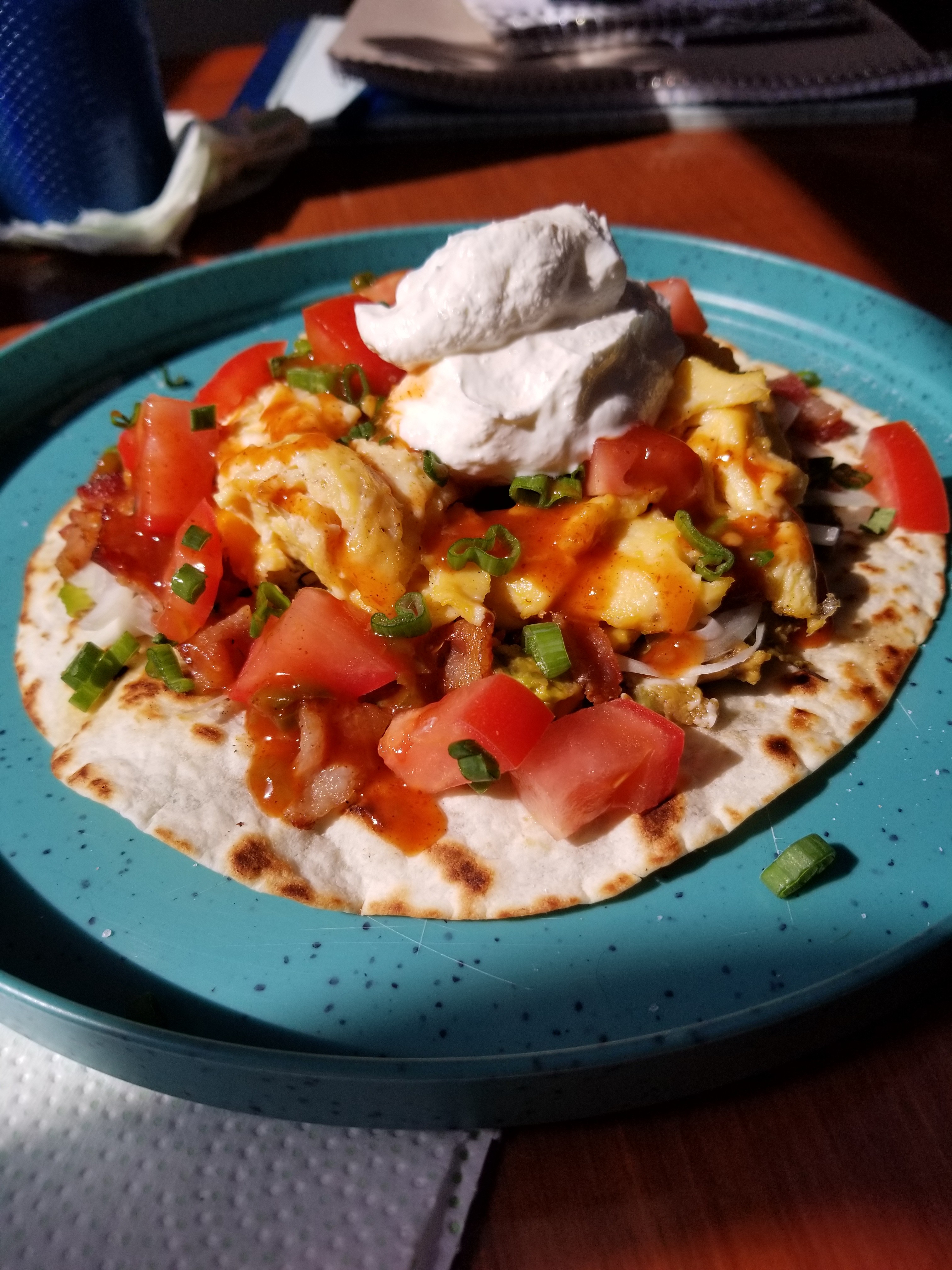 Leila’s Breakfast Mexican Pizza (Cheesy Scrambled Eggs, Avocado, Hickory Bacon, Roma Tomato, White Onion, Taco Sauce, Cheddar Cheese, Hampshire Sour Cream, Green Onions, Grilled Flour Tortilla)