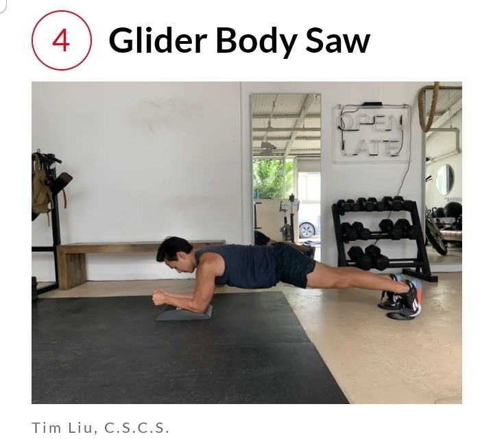 Assume a pushup position, keeping your shoulders in line with your wrists and your back straight. Keep your core tight and glutes squeezed, and lower yourself under control until your whole body is on the floor. Once you’ve reached the bottom, take your hands off the ground, then place them back to push yourself up. Flex your triceps and chest at the top to finish before performing another rep. Complete 10 sets of 15 reps.Get into position by lying flat on your back with your knees bent 90 degrees. Keeping your core tight, curl up, and reach to one side while extending your legs out at the same time. Crunch hard at the top, return to starting position, then crunch up on the other. Perform 10 reps on each side.Set yourself up against the wall with your heels, butt, and shoulders touching the wall. Get your shoulder in line with your wrist and feet stacked on top of each other. Keep your core tight and glutes squeezed as you tilt and flex your hips straight up and down, maintaining tension in your obliques. Perform 3 sets of 10 reps on each leg.Get into a plank position with both of your feet on the gliders, plates, or socks on a wooden surface. Keeping your core tight and glutes squeezed, slide forward and back with your torso, leading with your forearms. As you move forward and back, maintain a neutral spine and tension in your core the entire time. Complete 10 to 15 reps.