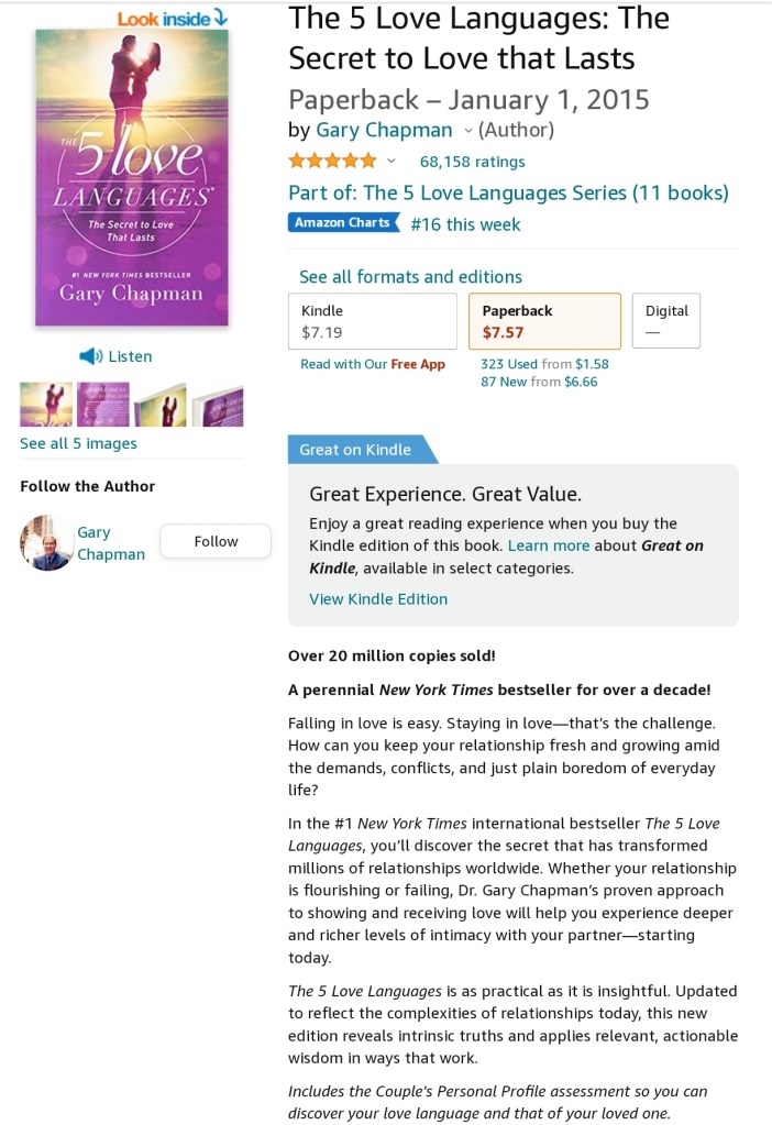 Basically, Gary Chapman breaks it down to 5 Languages of Love. Everyone is different, therefore, they want to be shown love differently. 1) The person that wants words of affirmation. 2) The person that wants quality time. 3) The person that wants physical touch. 4) The person that wants acts of service. And, 5) The person that wants to receive gifts. There are quizzes and more within his books to help define you and what you are looking for at your core, and your partner(s).