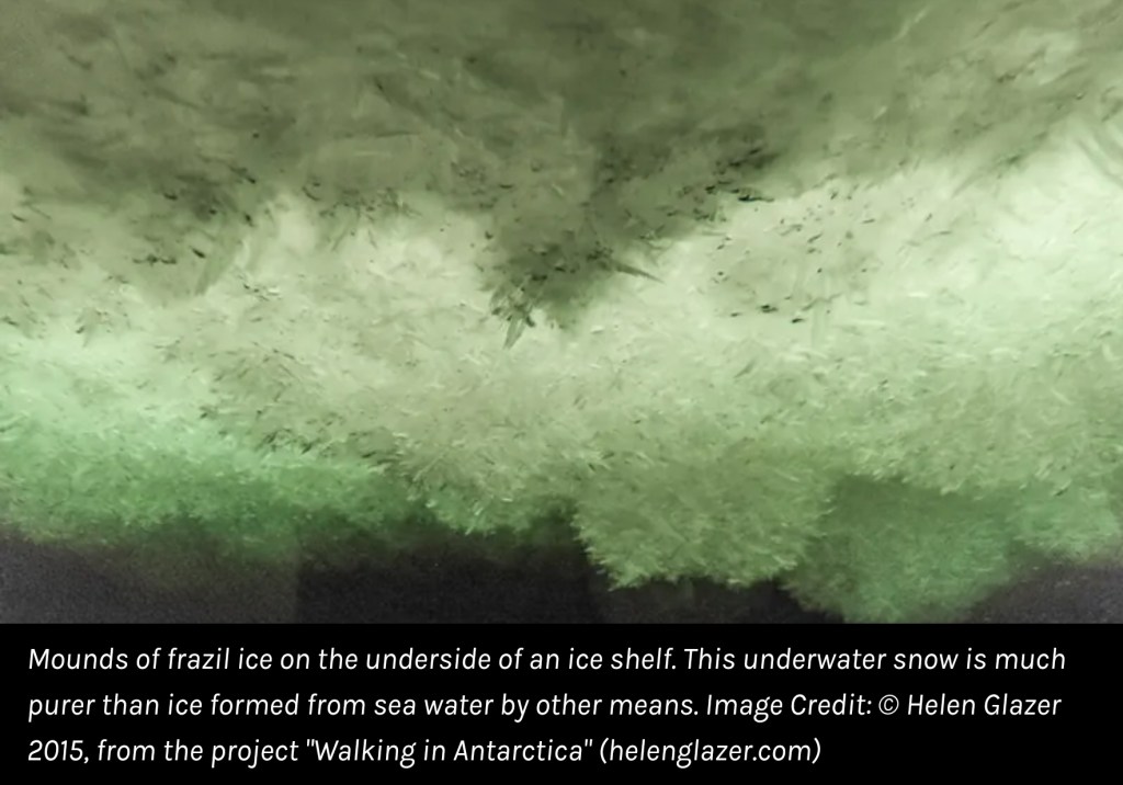 Congelation ice, formed when water in contact with the existing shelf freezes, is known to contain much less salt than the ocean below. But, it turns out frazil ice – more poetically known as underwater snow – is purer still. Where congelation ice has about 90 percent less salt per liter than the ocean, rising to 99 percent under certain conditions, frazil ice keeps out about 99.9 percent, the paper reports.