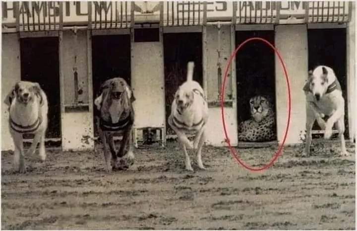 The photo shows a fast race between dogs and a leopard, the goal was to see who was the fastest.