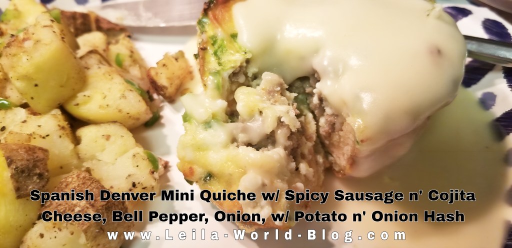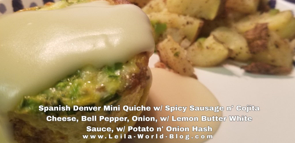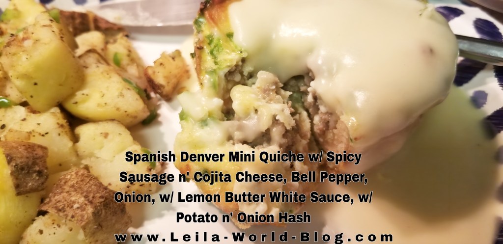 - Spanish Denver Mini Quiches w/Cojita Cheese, Spicy Sausage, Peppers, Onions, Coarse Sea Salt, Pepper, Herbs, and Lemon Butter Creamy White Sauce