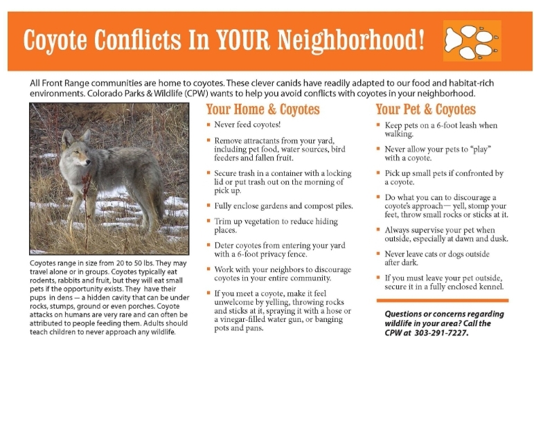 If a coyote attacks your pet, or if you have an unexpected encounter with a coyote in which the animal appears aggressive, please report the incident to Animal Control.