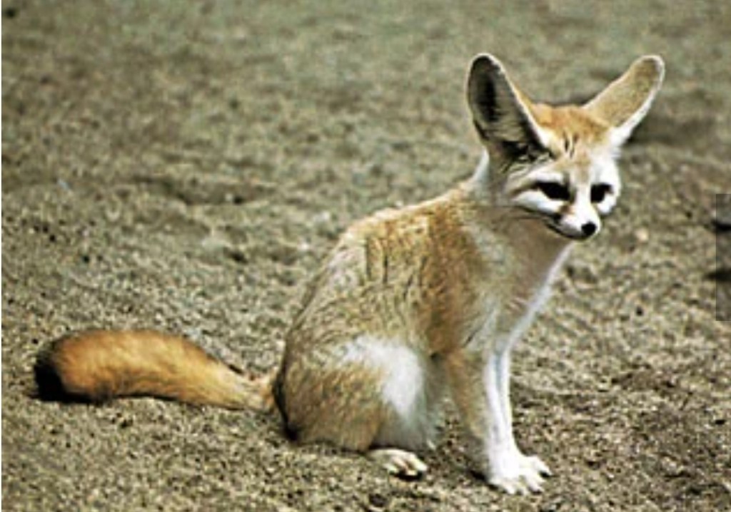 Smallest fox (about 1 kg), often classified in its own separate genus; adaptations for North African desert life include hairy soles to facilitate traction and protect feet from hot sand as well as huge ears to detect burrowing insects and small mammals; coat light tan.