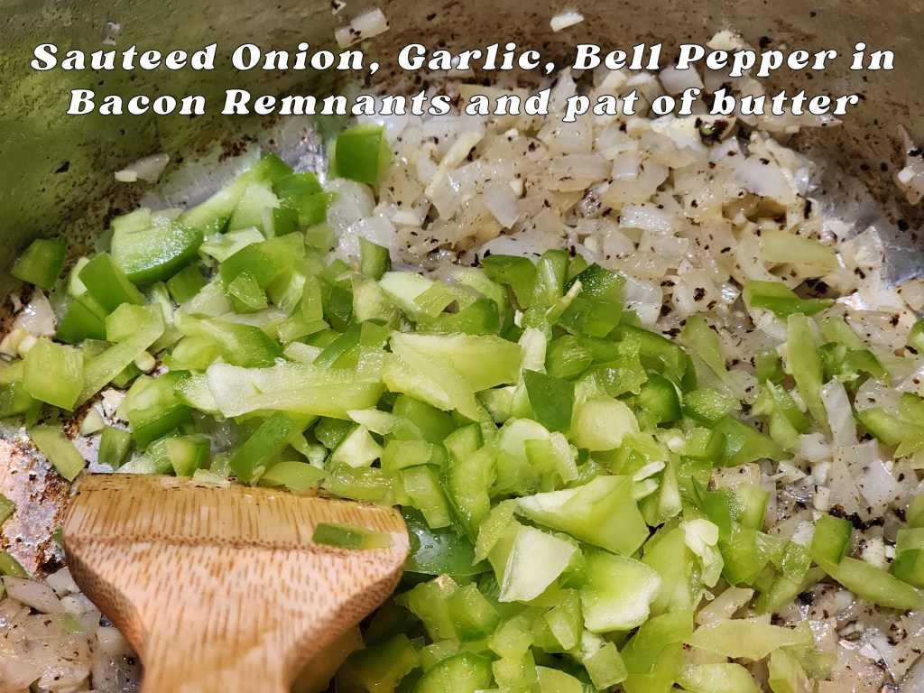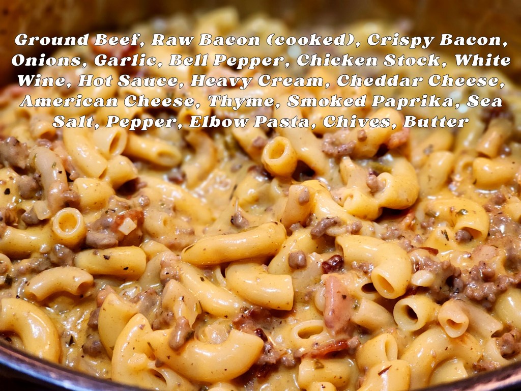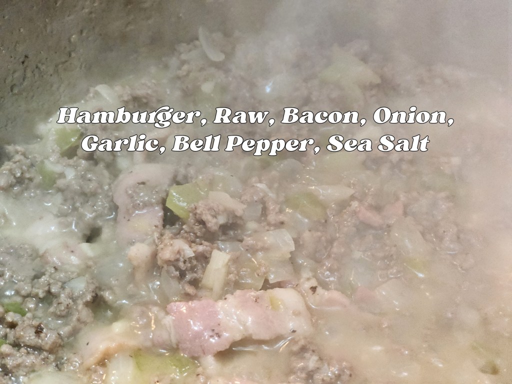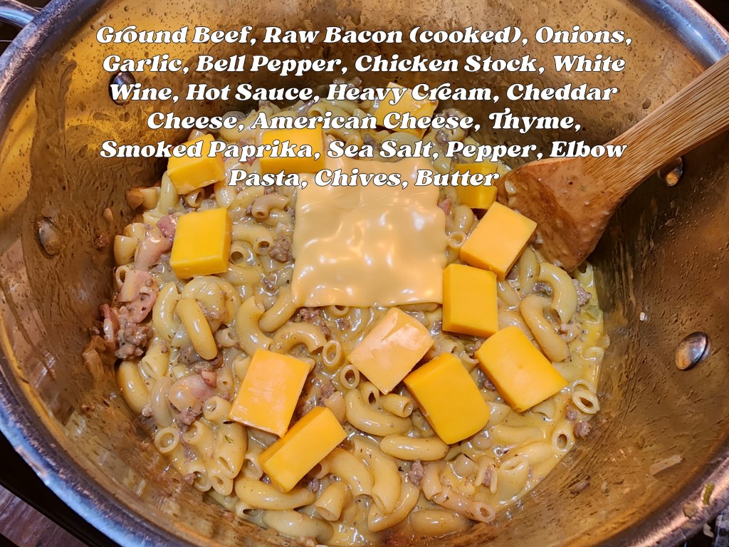 I cooked and crisped my 9 slices of bacon first, remove from pot set aside. I rinsed pot (not washed), I wanted the bacon renderings. Added 1 pat butter, onions, and garlic, sauteed til almost clear. Added bell pepper. Continued cooking til almost soft, added beef, raw bacon, and continued with Original recipe. At end I folded in Chives, 1 last pat of butter, and Crispy Bacon. Very rich dish in taste and texture. I did opt to use Thyme instead of Bay Leaf. I didn’t grate my cheese, I cubed it small. The Bell pepper and two different textures of bacon played out beautifully. You even add some chopped Roma Tomatoes if you really want to go all out. I think I just forgot.