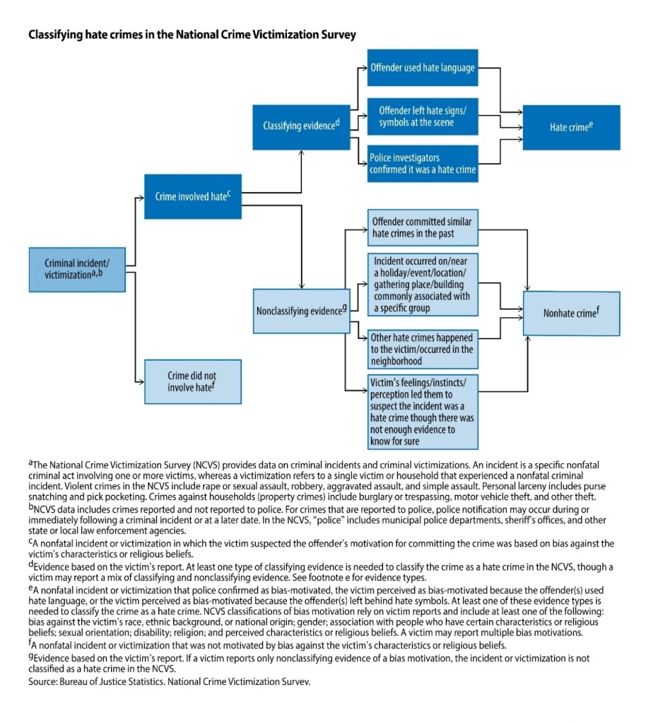 Through the HCSP, the FBI Uniform Crime Reporting (UCR) Program collects hate crime data on crimes that were motivated by an offender’s bias against a race, religion, disability, sexual orientation, ethnicity, gender, or gender identity. The categories of bias have changed over time, and now include 6 categories of bias motivation and 34 specific types of bias. Determining if an offender was motivated by bias can be difficult, and the FBI instructs reporting agencies to report bias “only if investigation reveals sufficient objective facts to lead a reasonable and prudent person to conclude that the offender’s actions were motivated, in whole or in part, by bias.”