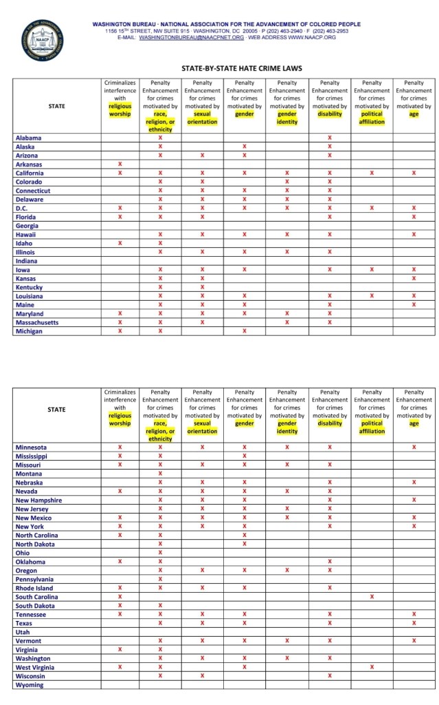 The following chart shows State by State, which Hate Crimes are are criminally recognized and enforceable.