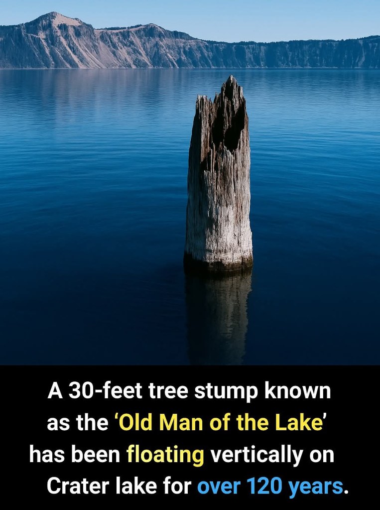 The “Old Man of the Lake” is a well-known floating tree stump in Crater Lake, located in Crater Lake National Park, Oregon, USA. It’s about 30 feet tall and has been floating upright in the lake for over 120 years. Here’s how it became famous: