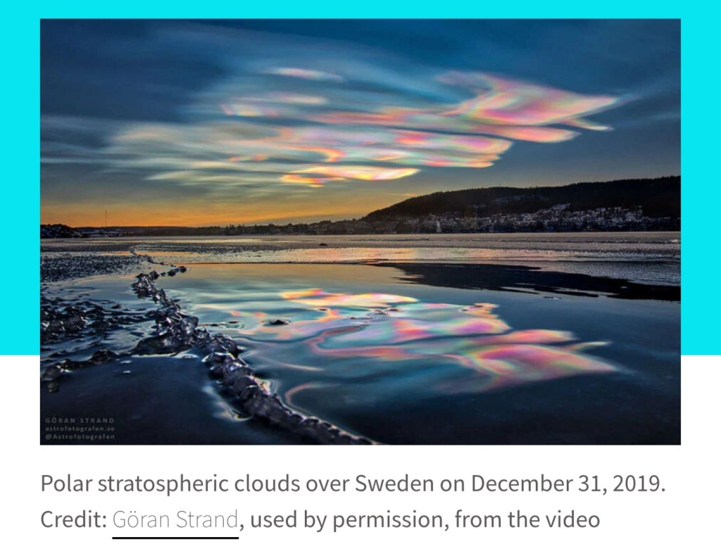 These clouds form in the extremely cold temperatures of the winter stratosphere over the poles.